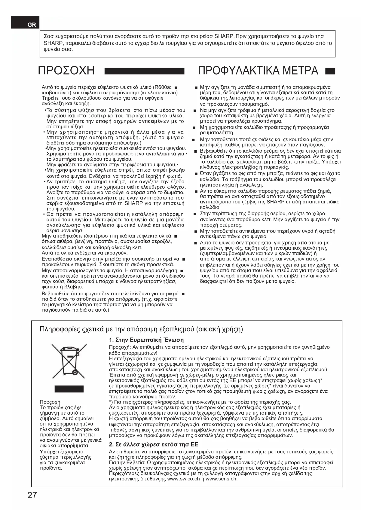 P27 Σασ ευχαριστούμε πολύ που αγοράσατε αυτό το προϊόν τησ εταιρείασ SHARP. Πριν χρησιμοποιήσετε το ψυγείο τησ SHARP, παρακαλώ διαβάστε αυτό το εγχειρίδιο λειτουργίασ για να σιγουρευτείτε ότι αποκτάτε το μέγιστο όφελοσ από το ψυγείο σασ.Αυτό το ψυγείο περιέχει εύφλεκτο ψυκτικό υλικό (R600a: ■ισοβουτάνιο) και εύφλεκτα αέρια μόνωσησ (κυκλοπεντάνιο). Τηρείτε τουσ ακόλουθουσ κανόνεσ για να αποφύγετε ανάφλεξη και έκρηξη. Το σύστημα ψύξησ που βρίσκεται στο πίσω μέροσ του • ψυγείου και στο εσωτερικό του περιέχει ψυκτικό υλικό. Μην επιτρέπετε την επαφή αιχμηρών αντικειμένων με το σύστημα ψύξησ. Μην χρησιμοποιήστε μηχανικά ή άλλα μέσα για να • επιταχύνετε την αυτόματη απόψυξη. (Αυτό το ψυγείο διαθέτει σύστημα αυτόματησ απόψυξησ.) Μην χρησιμοποιείτε ηλεκτρικέσ συσκευέσ εντόσ του ψυγείου.• Χρησιμοποιείτε μόνο τα προδιαγραφόμενα ανταλλακτικά για • το λαμπτήρα του χώρου του ψυγείου.Μην φράζετε τα ανοίγματα στην περιφέρεια του ψυγείου.• Μη χρησιμοποιείτε εύφλεκτα σπρέι, όπωσ σπρέι βαφήσ • κοντά στο ψυγείο. Ενδέχεται να προκληθεί έκρηξη ή φωτιά. Αν τρυπήσει το σύστημα ψύξησ, μην αγγίζετε την έξοδο • προσ τον τοίχο και μην χρησιμοποιείτε ελεύθερεσ φλόγεσ. Ανοίξτε το παράθυρο για να φύγει ο αέρασ από το δωμάτιο. Στη συνέχεια, επικοινωνήστε με έναν αντιπρόσωπο του σέρβισ εξουσιοδοτημένο από τη SHARP για την επισκευή του ψυγείου. Θα πρέπει να πραγματοποιείται η κατάλληλη απόρριψη • αυτού του ψυγείου. Μεταφέρετε το ψυγείο σε μια μονάδα ανακύκλωσησ για εύφλεκτα ψυκτικά υλικά και εύφλεκτα αέρια μόνωσησ.Μην αποθηκεύετε ιδιαιτέρωσ πτητικά και εύφλεκτα υλικά ■όπωσ αιθέρα, βενζίνη, προπάνιο, συσκευασίεσ αεροζόλ, κολλώδεισ ουσίεσ και καθαρή αλκοόλη κλπ. Αυτά τα υλικά ενδέχεται να εκραγούν.Εναποθέσεισ σκόνησ στην μπρίζα τησ συσκευήσ μπορεί να ■προκαλέσουν πυρκαγιά. Σκουπίστε τη σκόνη προσεκτικά.Μην αποσυναρμολογείτε το ψυγείο. Η αποσυναρμολόγηση ■ και οι επισκευέσ πρέπει να αναλαμβάνονται μόνο από ειδικούσ τεχνικούσ, διαφορετικά υπάρχει κίνδυνοσ ηλεκτροπληξίασ, φωτιάσ ή βλάβησ.Βεβαιωθείτε ότι το ψυγείο δεν αποτελεί κίνδυνο για τα μικρά ■παιδιά όταν το αποθηκεύετε για απόρριψη. (π.χ. αφαιρέστε το μαγνητικό κλείστρο τησ πόρτασ για να μη μπορούν να παγιδευτούν παιδιά σε αυτό.)