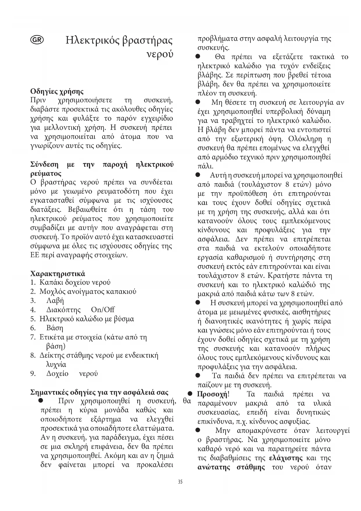 Η συσκευή αυτή προορίζεται για οικιακή χρήση ή παρόμοιες χρήσεις, όπως για παράδειγμα: - σε γραφεία και άλλα εργασιακά περιβάλλοντα, - σε γεωργικές περιοχές, - από πελάτες σε ξενοδοχεία, πανδοχεία κτλ. και παρόμοιες εγκαταστάσεις, - σε ξενώνες που σερβίρουν πρωινό. Για να τηρείτε τους κανονισμούς ασφαλείας και να αποφεύγετε ενδεχόμενους κινδύνους, φροντίζετε οι επισκευές των ηλεκτρικών συσκευών και η αντικατάσταση του ηλεκτρικού καλωδίου να γίνονται από ειδικευμένους τεχνικούς. Αν χρειασθεί επισκευή, παρακαλούμε, στείλτε τη συσκευή σε ένα από τα κέντρα εξυπηρέτησης των πελατών μας. Θα βρείτε τις διευθύνσεις στο παράρτημα του εγχειριδίου. Ασφάλεια κατά της υπερθέρμανσης Υπάρχει μηχανισμός διακοπής της λειτουργίας του βραστήρα, ο οποίος είναι προρυθμισμένος για το ενδεχόμενο να τεθεί ο βραστήρας σε λειτουργία χωρίς νερό ή όταν το ηλεκτρικό στοιχείο έχει καλυφθεί από άλατα. Από τη στιγμή που θα λειτουργήσει αυτός ο μηχανισμός και τεθεί ο βραστήρας εκτός λειτουργίας, πρέπει να τον αφήσετε να κρυώσει ή να αφαιρέσετε τα άλατα από την αντίσταση, πριν η συσκευή τεθεί και πάλι σε λειτουργία. Πριν από την πρώτη χρήση Για να διασφαλίσετε ότι η συσκευή είναι απόλυτα καθαρή, βράστε και πετάξτε την πρώτη ποσότητα νερού. Βραστό νερό – Βγάλτε το δοχείο από τη βάση του. – Ανοίξτε το καπάκι και γεμίστε το δοχείο με νερό στην επιθυμητή στάθμη φροντίζοντας να τηρήσετε τις ενδείξεις του ανωτάτου και κατωτάτου ορίου. – Κλείστε το καπάκι και τοποθετήστε το δοχείο ξανά στη βάση του. – Τοποθετήστε το φις του ηλεκτρικού καλωδίου σε κατάλληλη πρίζα και 36πιέστε το διακόπτη On/O . Θα ανάψει η ενδεικτική λυχνία στο δείκτη στάθη