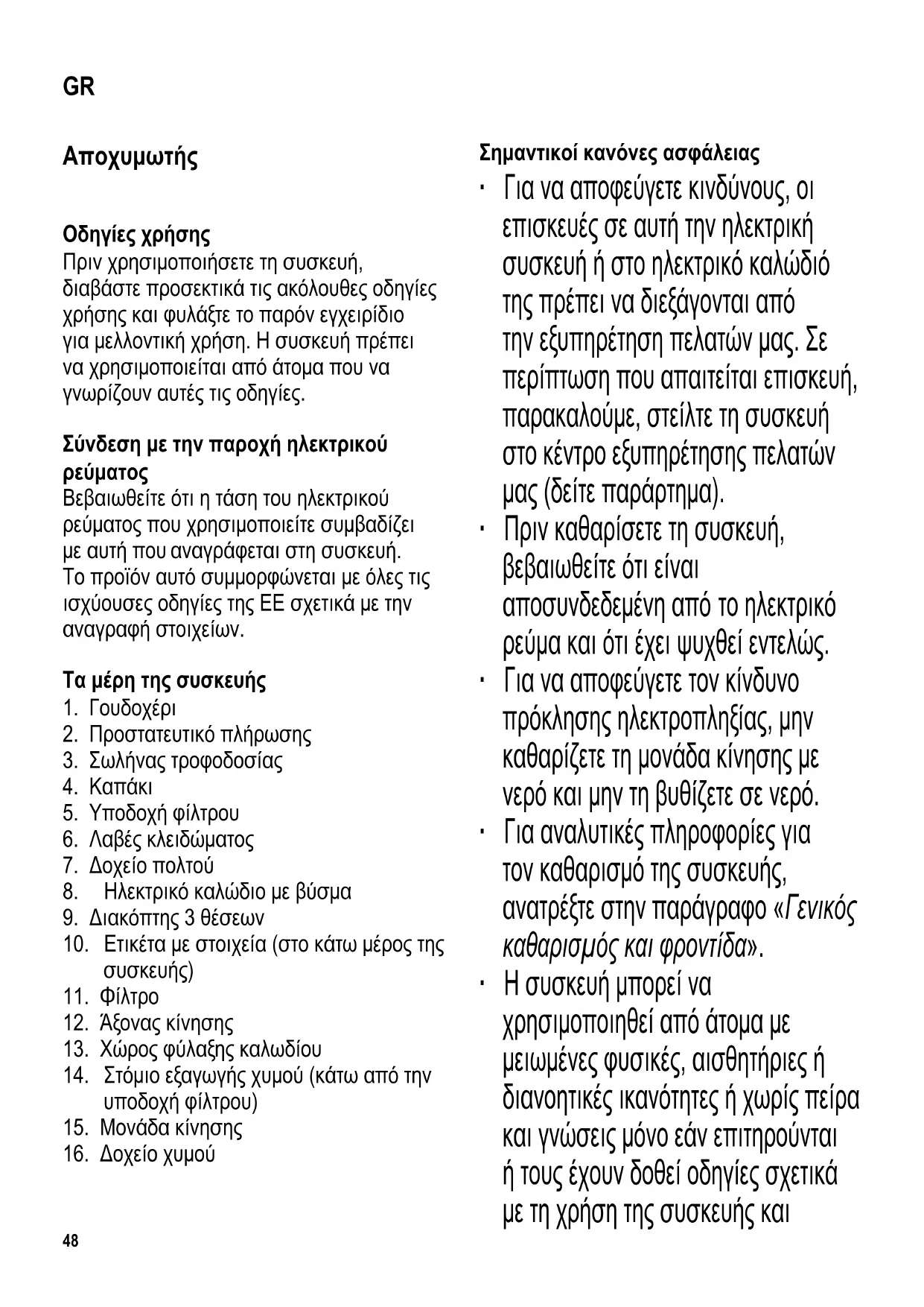 Σημαντικοί κανόνες ασφάλειας ∙ Για να αποφεύγετε κινδύνους, οι επισκευές σε αυτή την ηλεκτρική συσκευή ή στο ηλεκτρικό καλώδιό της πρέπει να διεξάγονται από την εξυπηρέτηση πελατών μας. Σε περίπτωση που απαιτείται επισκευή, παρακαλούμε, στείλτε τη συσκευή στο κέντρο εξυπηρέτησης πελατών μας (δείτε παράρτημα). ∙ Πριν καθαρίσετε τη συσκευή, βεβαιωθείτε ότι είναι αποσυνδεδεμένη από το ηλεκτρικό ρεύμα και ότι έχει ψυχθεί εντελώς. ∙ Για να αποφεύγετε τον κίνδυνο πρόκλησης ηλεκτροπληξίας, μην καθαρίζετε τη μονάδα κίνησης με νερό και μην τη βυθίζετε σε νερό. ∙ Για αναλυτικές πληροφορίες για τον καθαρισμό της συσκευής, ανατρέξτε στην παράγραφο «Γενικός καθαρισμός και φροντίδα». ∙ Η συσκευή μπορεί να χρησιμοποιηθεί από άτομα με μειωμένες φυσικές, αισθητήριες ή διανοητικές ικανότητες ή χωρίς πείρα και γνώσεις μόνο εάν επιτηρούνται ή τους έχουν δοθεί οδηγίες σχετικά με τη χρήση της συσκευής και GR49 κατανοούν πλήρως όλους τους εμπλεκόμενους κίνδυνους και προφυλάξεις για την ασφάλεια. ∙ Τα παιδιά δεν πρέπει να επιτρέπεται να χρησιμοποιούν τη συσκευή. Κρατήστε πάντα τη συσκευή και το ηλεκτρικό καλώδιό της μακριά από