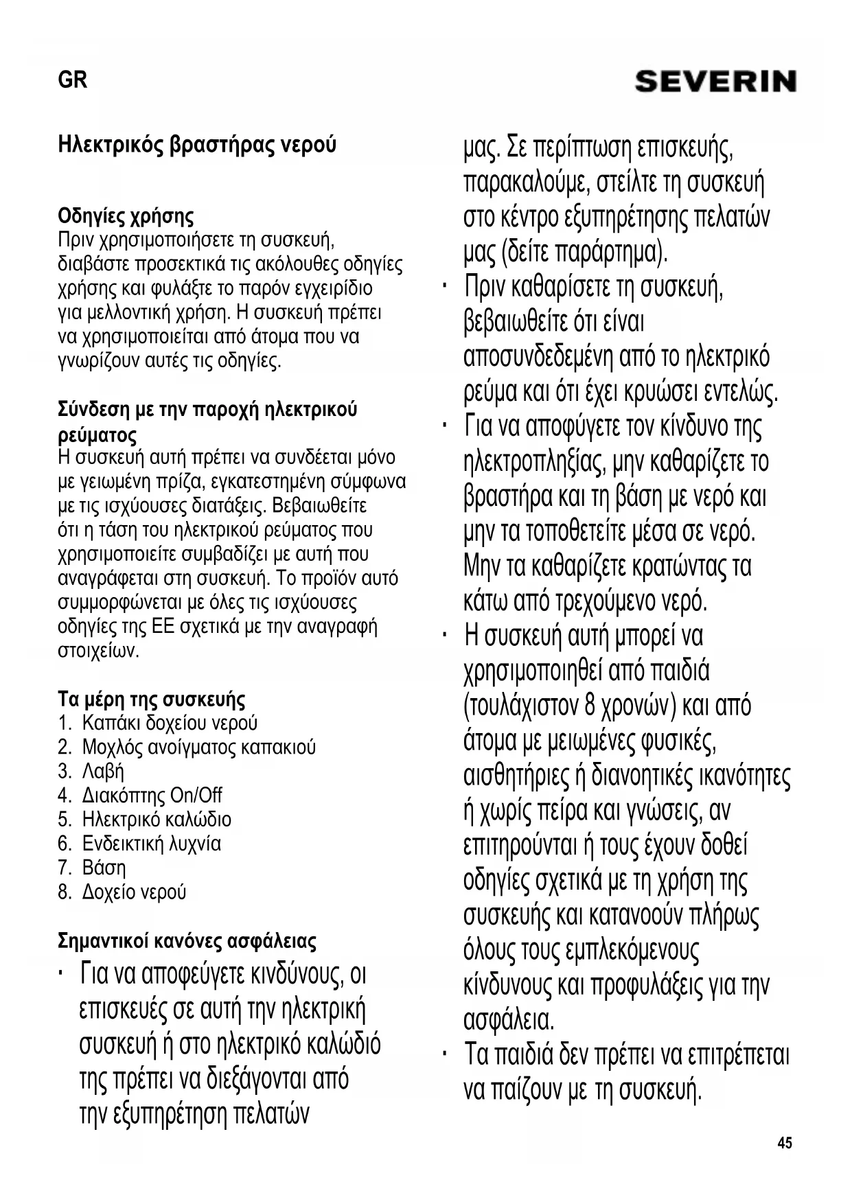 Σημαντικοί κανόνες ασφάλειας ∙ Για να αποφεύγετε κινδύνους, οι επισκευές σε αυτή την ηλεκτρική συσκευή ή στο ηλεκτρικό καλώδιό της πρέπει να διεξάγονται από την εξυπηρέτηση πελατών μας. Σε περίπτωση επισκευής, παρακαλούμε, στείλτε τη συσκευή στο κέντρο εξυπηρέτησης πελατών μας (δείτε παράρτημα). ∙ Πριν καθαρίσετε τη συσκευή, βεβαιωθείτε ότι είναι αποσυνδεδεμένη από το ηλεκτρικό ρεύμα και ότι έχει κρυώσει εντελώς. ∙ Για να αποφύγετε τον κίνδυνο της ηλεκτροπληξίας, μην καθαρίζετε το βραστήρα και τη βάση με νερό και μην τα τοποθετείτε μέσα σε νερό. Μην τα καθαρίζετε κρατώντας τα κάτω από τρεχούμενο νερό. ∙ Η συσκευή αυτή μπορεί να χρησιμοποιηθεί από παιδιά (τουλάχιστον 8 χρονών