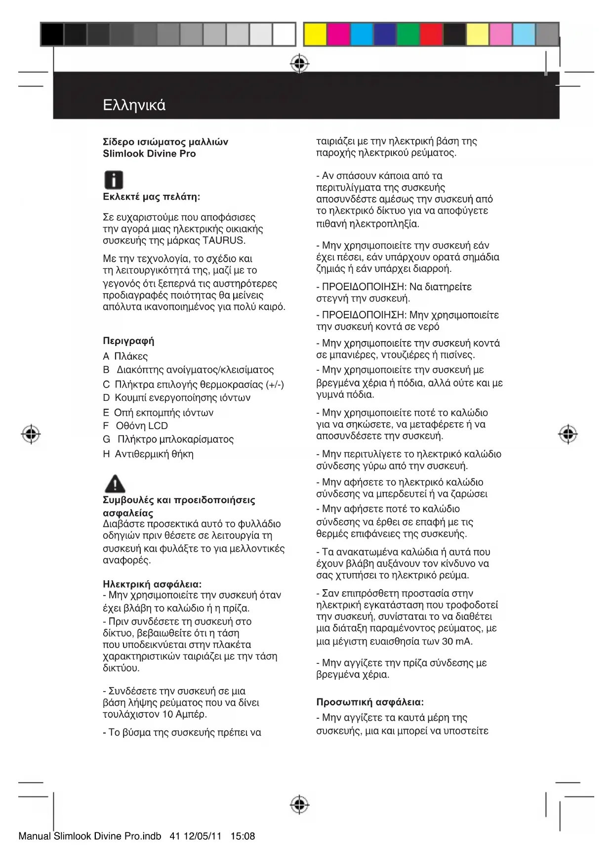 Κατεβάστε τις οδηγίες για το Ισιωτικό μαλλιών σε μορφή PDF δωρεάν! Βρείτε το εγχειρίδιό σας Slimlook Divine Pro - TAURUS και πάρτε ξανά την ηλεκτρονική σας συσκευή στα χέρια σας. Σε αυτή τη σελίδα δημοσιεύονται όλα τα έγγραφα που απαιτούνται για τη χρήση της συσκευής σας. Slimlook Divine Pro της μάρκας TAURUS.