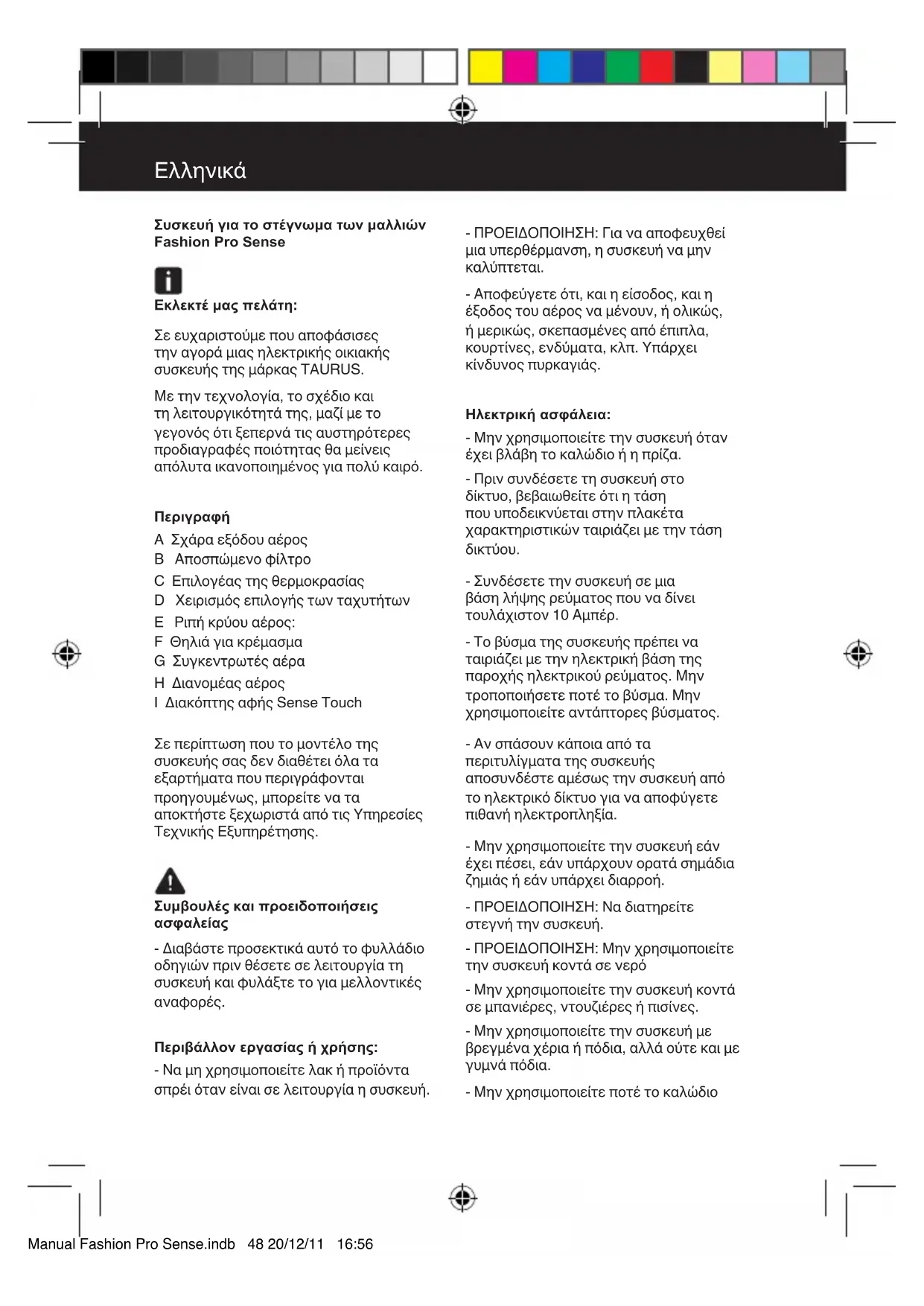 Κατεβάστε τις οδηγίες για το Πιστολάκι μαλλιών σε μορφή PDF δωρεάν! Βρείτε το εγχειρίδιό σας Fashion Pro Sense - TAURUS και πάρτε ξανά την ηλεκτρονική σας συσκευή στα χέρια σας. Σε αυτή τη σελίδα δημοσιεύονται όλα τα έγγραφα που απαιτούνται για τη χρήση της συσκευής σας. Fashion Pro Sense της μάρκας TAURUS.