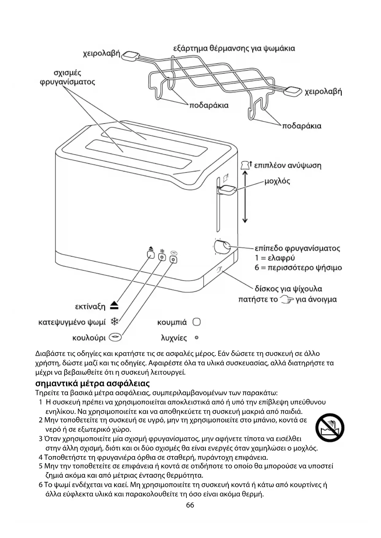 16 Να διατηρείτε τη συσκευή και το καλώδιο μακριά από εστίες, τζάκια ή καυστήρες. 17 Μη χρησιμοποιείτε τη συσκευή για οποιονδήποτε σκοπό πέραν αυτού που περιγράφεται στις παρούσες οδηγίες. 18 Αυτή η συσκευή δεν πρέπει να λειτουργεί με εξωτερικό χρονοδιακόπτη ή σύστημα τηλεχειρισμού. 19 Μη χρησιμοποιείτε τη συσκευή εάν είναι φθαρμένη ή παρουσιάζει δυσλειτουργίες. 20 Εάν το καλώδιο είναι φθαρμένο, πρέπει να αντικατασταθεί από τον κατασκευαστή, τον αντιπρόσωπό του ή κάποιο εξουσιοδοτημένο πρόσωπο προς αποφυγή κινδύνων. αποκλειστικά για οικιακή χρήση πριν από την πρώτη χρήση 1 Ρυθμίστε το επίπεδο φρυγανίσματος στο μέγιστο (με όλες τις λυχνίες επιπέδου φρυγανίσματος αναμμένες). 2 Αφήστε τη συσκευή να λειτουργήσει κενή ώστε να "στρώσουν" τα νέα στοιχεία. 3 Μπορεί να υπάρξει κάποια μυρωδιά, αλλά δεν είναι κάτι ανησυχητικό. Βεβαιωθείτε ότι το δωμάτιο αερίζεται καλά. φρυγάνισμα ψωμιού 4 Τοποθετήστε τη φρυγανιέρα όρθια σε σταθερή, πυράντοχη επιφάνεια. 5 Μην την τοποθετείτε σε επιφάνεια ή κοντά σε οτιδήποτε το οποίο θα μπορούσε να υποστεί ζημιά ακόμα και από μέτριας έντασης θερμότητα. 6 Το ψωμί ενδέχεται να καεί. Μη χρησιμοποιείτε τη συσκευή κοντά ή κάτω από κουρτίνες ή άλλα εύφλεκτα υλικά και παρακολουθείτε τη όσο είναι ακόμα θερμή. 7 Συνδέστε το φις με την πρίζα ρεύματος. 8 Ρυθμίστε το επίπεδο φρυγανίσματος στην απαιτούμενη θέση (1 = ελαφρύ ψήσιμο, 6 = μέγιστο ψήσιμο). 9 Τοποθετήστε ψωμί στη σχισμή φρυγανίσματος (μέγιστο πάχος 25 mm). 10 Πιέστε πλήρως κάτω το μοχλό. , Εάν η φρυγανιέρα δεν είναι συνδεδεμένη στο ρεύμα, δεν πρόκειται να κλειδώσει κάτω. 11 Όταν ολοκληρωθεί αυτό, το ψωμί εκτιναχθεί και τα στοιχεία θα απενεργοποιηθούν.