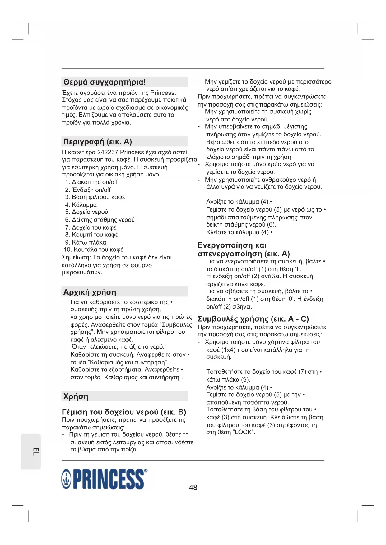 Θερμά συγχαρητήρια! Έχετε αγοράσει ένα προϊόν της Princess. Στόχος μας είναι να σας παρέχουμε ποιοτικά προϊόντα με ωραίο σχεδιασμό σε οικονομικές τιμές. Ελπίζουμε να απολαύσετε αυτό το προϊόν για πολλά χρόνια. Περιγραφή (εικ. A) Η καφετιέρα 242237 Princess έχει σχεδιαστεί για παρασκευή του καφέ. Η συσκευή προορίζεται για εσωτερκή χρήση μόνο. Η συσκευή προορίζεται για οικιακή χρήση μόνο.