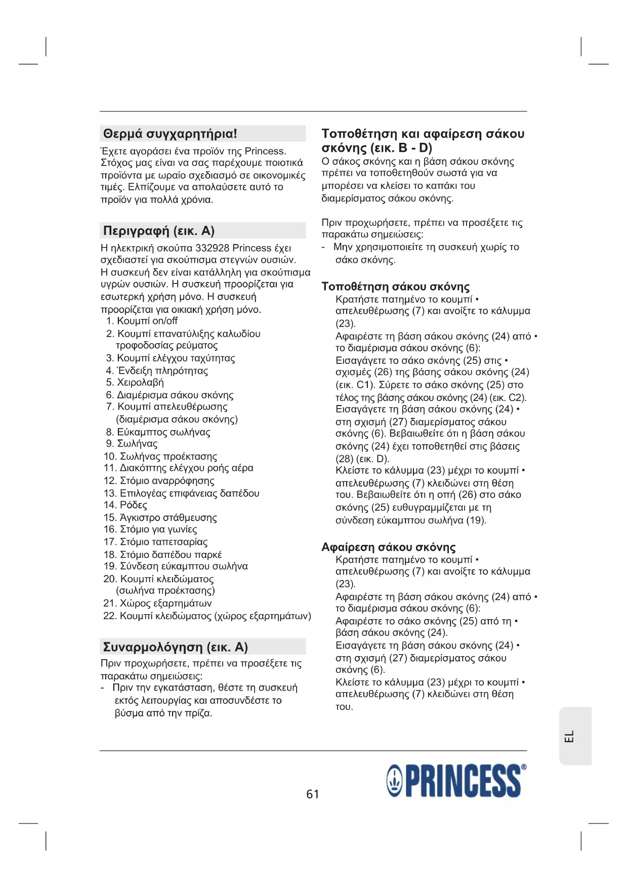 Θερμά συγχαρητήρια! Έχετε αγοράσει ένα προϊόν της Princess. Στόχος μας είναι να σας παρέχουμε ποιοτικά προϊόντα με ωραίο σχεδιασμό σε οικονομικές τιμές. Ελπίζουμε να απολαύσετε αυτό το προϊόν για πολλά χρόνια. Περιγραφή (εικ. A) Η ηλεκτρική σκούπα 332928 Princess έχει σχεδιαστεί για σκούπισμα στεγνών ουσιών. Η συσκευή δεν είναι κατάλληλη για σκούπισμα υγρών ουσιών. Η συσκευή προορίζεται για εσωτερκή χρήση μόνο. Η συσκευή προορίζεται για οικιακή χρήση μόνο.