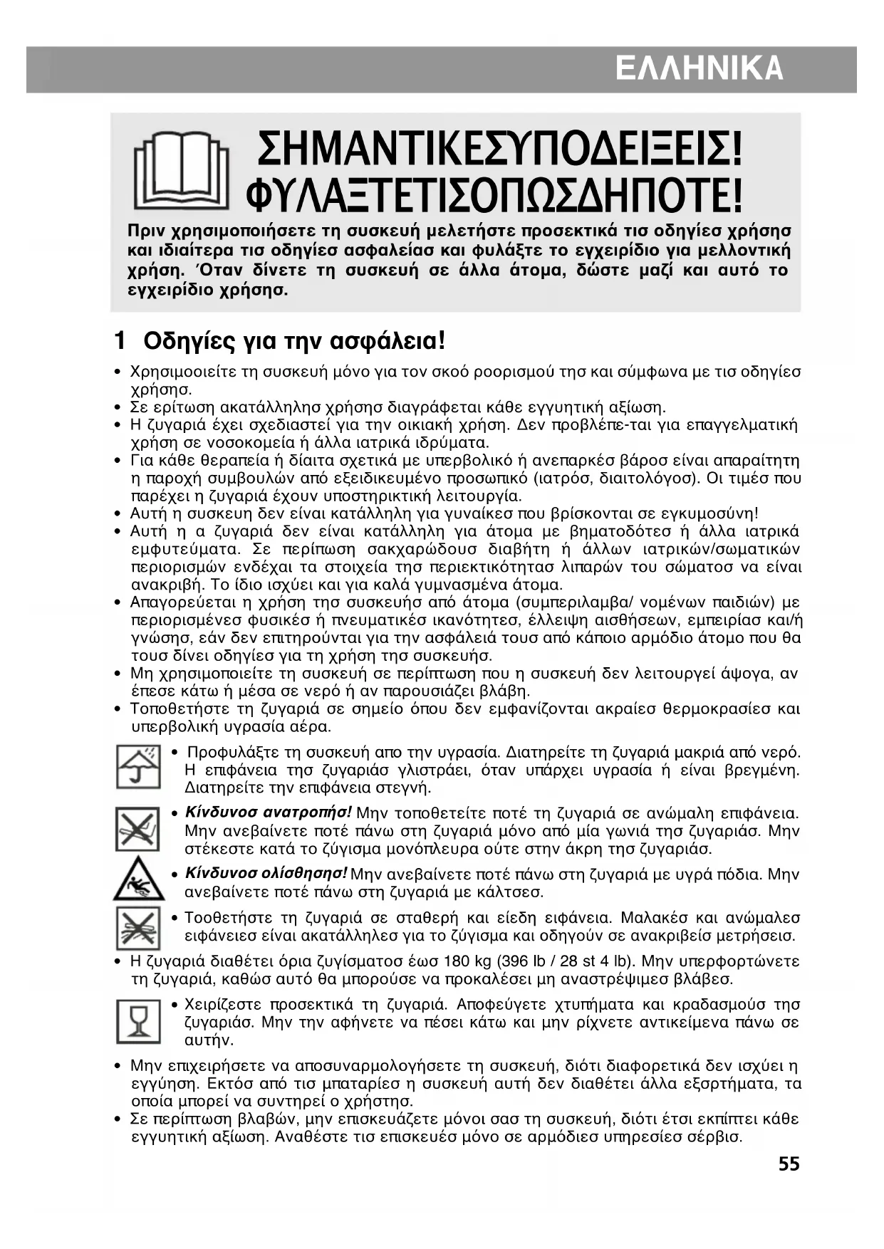 - Η ζυγαριά διαθέτει όρια ζυγίσματοσ έωσ 180 kg (396 lb / 28 st 4 lb). Μην υπερφορτώνετε τη ζυγαριά, καθώσ αυτό θα μπορούσε να προκαλέσει μη αναστρέψιμεσ βλάβεσ. Χειρίζεστε προσεκτικά τη ζυγαριά. Αποφεύγετε χτυπήματα και κραδασμούσ τησζυγαριάσ. Μην την αφήνετε να πέσει κάτω καιμην ρίχνετε αντικείμενα πάνω σεαυτήν.