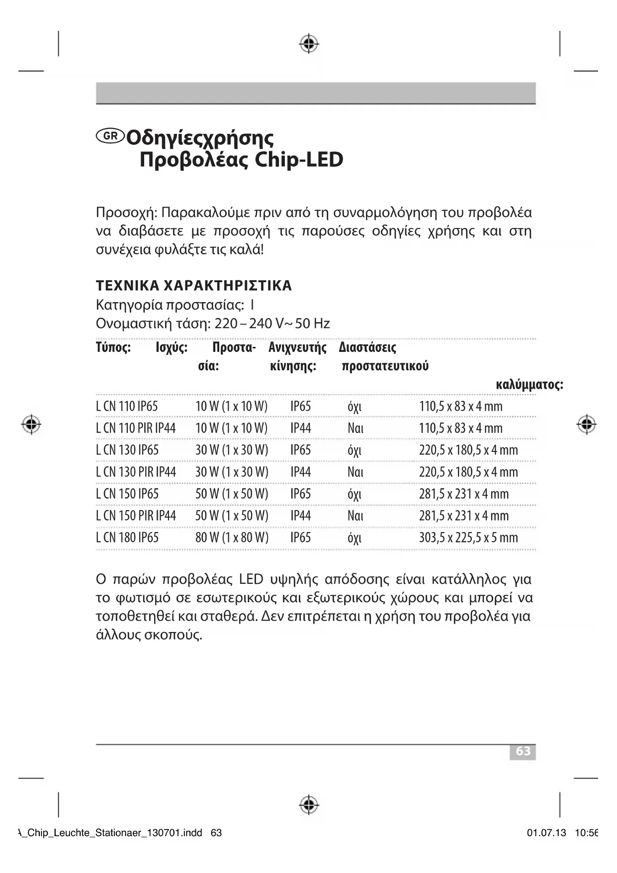 Οδηγίες χρήσης Προβολέας Chip-LED Προσοχή: Παρακαλούμε πριν από τη συναρμολόγηση του προβολέα να διαβάσετε με προσοχή τις παρούσες οδηγίες χρήσης και στη συνέχεια φυλάξτε τις καλά! ΤΕΧΝΙΚΆ ΧΆΡΆΚΤΗΡΙΣΤΙΚΆ Κατηγορία προστασίας: I Ονομαστική τάση: 220 – 240V~ 50Hz Τύπος: Ισχύς: Προστα- Ανιχνευτής Διαστάσεις σία: κίνησης: προστατευτικού καλύμματος: L CN 110 IP65 10W (1 x 10W) IP65 όχι 110,5 x 83 x 4mm L CN 110 PIR IP44 10W (1 x 10W) IP44 Ναι 110,5 x 83 x 4mm L CN 130 IP65 30W (1 x 30W) IP65 όχι 220,5 x 180,5 x 4mm L CN 130 PIR IP44 30W (1 x 30W) IP44 Ναι 220,5 x 180,5 x 4mm L CN 150 IP65 50W (1 x 50W) IP65 όχι 281,5 x 231 x 4mm L CN 150 PIR IP44 50W (1 x 50W) IP44 Ναι 281,5 x 231 x 4mm L CN 180 IP65 80W (1 x 80W) IP65 όχι 303,5 x 225,5 x 5mm Ο παρών προβολέας LED υψηλής απόδοσης είναι κατάλληλος για το φωτισμό σε εσωτερικούς και εξωτερικούς χώρους και μπορεί να τοποθετηθεί και σταθερά. Δεν επιτρέπεται η χρήση του προβολέα για άλλους σκοπούς. BA_Chip_Leuchte_Stationaer_130701.indd 63 01.07.13 10:5664