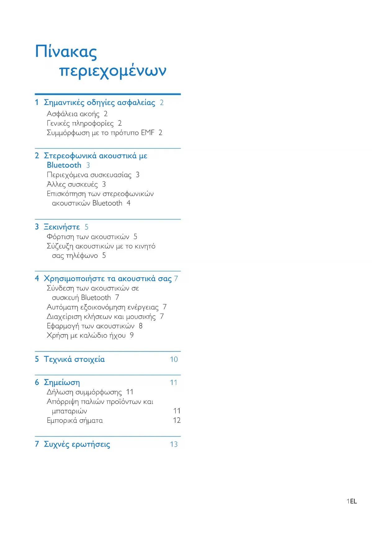 Bluetooth Συγχαρητήρια για την αγορά σας και καλώς ήλθατε στη Philips! Για να επωφεληθείτε πλήρως από την υποστήριξη που προσφέρει η Philips, δηλώστε το προϊόν σας στη διεύθυνση www.philips.com/welcome.Με αυτά τα ασύρματα ακουστικά με στήριγμα κεφαλής της Philips, μπορείτε:• Να απολαμβάνετε άνετες, ασύρματες τηλεφωνικές κλήσεις μέσω handsfree.• Να ακούτε και να ελέγχετε τη μουσική με ασύρματο τρόπο.• Να εναλλάσσεστε μεταξύ τηλεφωνικών κλήσεων και μουσικής.• Να ακούτε μουσική σε συσκευές που δεν διαθέτουν τη λειτουργία Bluetooth, χρησιμοποιώντας ένα καλώδιο ήχου.Περιεχόμενα συσκευασίας