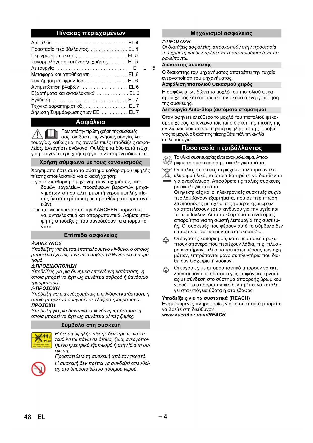 Οι διατάξεις ασφαλείας αποσκοπούν στην προστασία του χρήστη και δεν πρέπει να τροποποιούνται ή να πα- ραλείπονται. Ο διακόπτης του μηχανήματος αποτρέπει την τυχαία ενεργοποίηση του μηχανήματος. Η ασφάλεια κλειδώνει το μοχλό του πιστολιού ψεκα- σμού χειρός και αποτρέπει την ακούσια ενεργοποίηση της συσκευής. Όταν αφήνετε ελεύθερο το μοχλό του πιστολιού ψεκα- σμού χειρός, απενεργοποιείται ο διακόπτης πίεσης της αντλία και διακόπτεται η ριπή υψηλής πίεσης. Τραβώ- ντας το μοχλό, ο διακόπτης πίεσης θέτει πάλι την αντλία σε λειτουργία. Υποδείξεις για τα συστατικά (REACH) Ενημερωμένες πληροφορίες για τα συστατικά μπορείτε να βρείτε στη διεύθυνση: www.kaercher.com/REACH Πίνακας περιεχομένων Ασφάλεια . . . . . . . . . . . . . . . . . . . . . . . . . . . . EL 4 Προστασία περιβάλλοντος. . . . . . . . . . . . . . . EL 4 Περιγραφή συσκευής. . . . . . . . . . . . . . . . . . . EL 5 Συναρμολόγηση και έναρξη χρήσης . . . . . . . EL 5 Λειτουργία . . . . . . . . . . . . . . . . . . . . . . . . . . .EL5 Μεταφορά και αποθήκευση . . . . . . . . . . . . . . EL 6 Συντήρηση και φροντίδα . . . . . . . . . . . . . . . . EL 6 Αντιμετώπιση βλαβών . . . . . . . . . . . . . . . . . . EL 6 Εξαρτήματα και ανταλλακτικά . . . . . . . . . . . . EL 6 Εγγύηση . . . . . . . . . . . . . . . . . . . . . . . . . . . . EL 7 Τεχνικά χαρακτηριστικά . . . . . . . . . . . . . . . . . EL 7 Δήλωση Συμμόρφωσης των ΕE . . . . . . . . . . EL 7