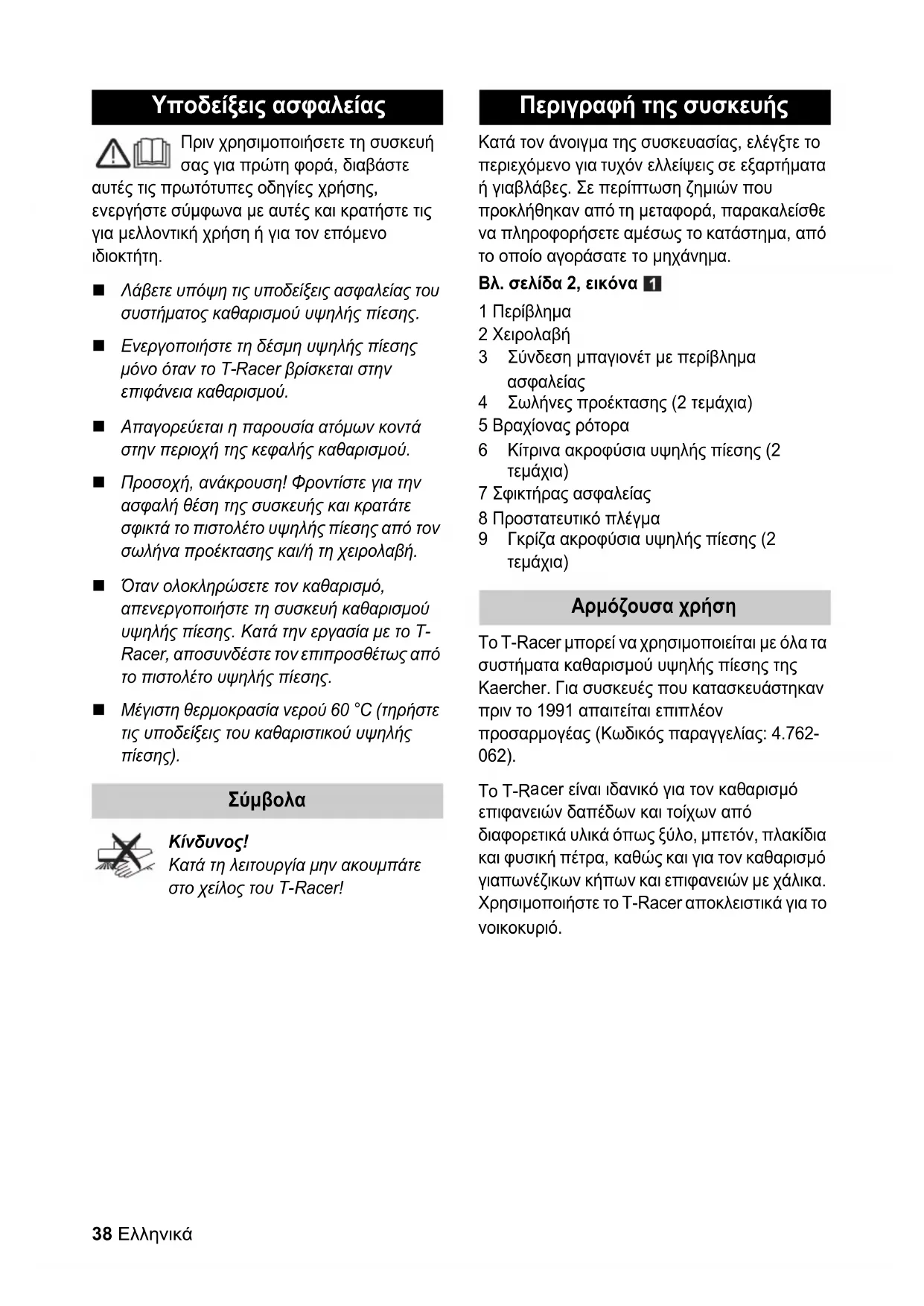 cer είναι ιδανικό για τον καθαρισμό επιφανειών δαπέδων και τοίχων από διαφορετικά υλικά όπως ξύλο, μπετόν, πλακίδια και φυσική πέτρα, καθώς και για τον καθαρισμό γιαπωνέζικων κήπων και επιφανειών με χάλικα. Χρησιμοποιήστε το T-Racer αποκλειστικά για το νοικοκυριό. Υποδείξεις ασφαλείας
