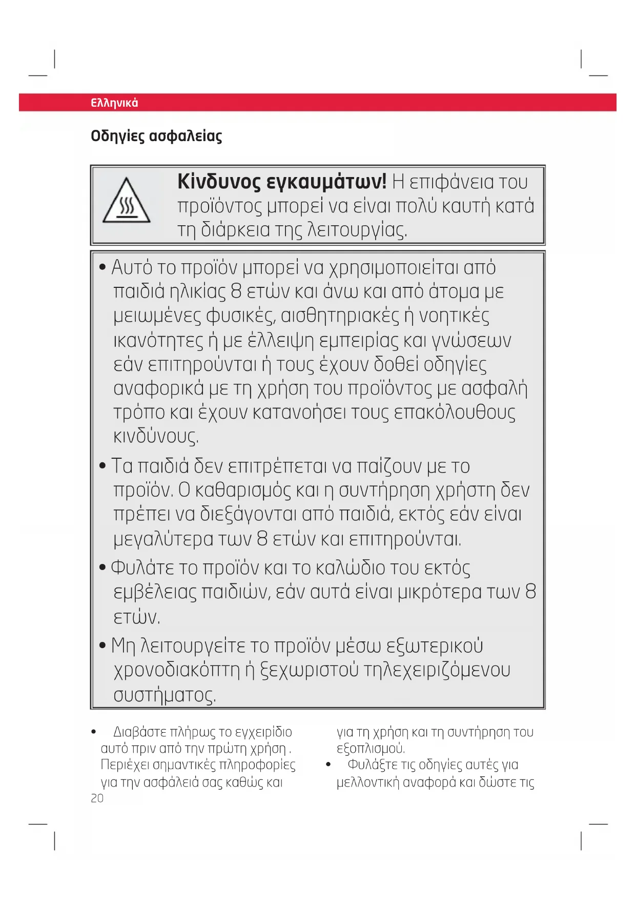 Κίνδυνος εγκαυμάτων! Η επιφάνεια του προϊόντος μπορεί να είναι πολύ καυτή κατά τη διάρκεια της λειτουργίας.