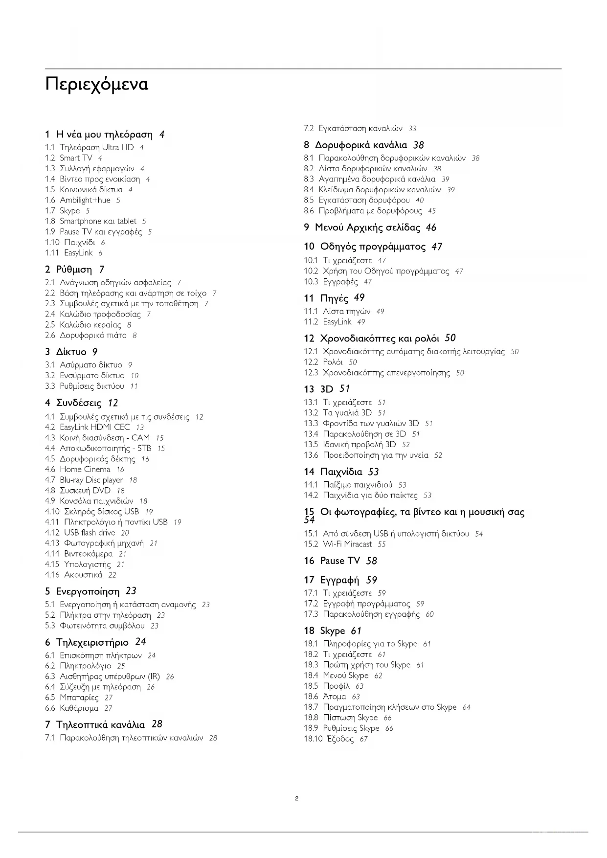 Skype™, τι είναι 61 Skype, παρακολούθηση ενοικιαζόμενων ταινιών και Προσωρινή διακοπή τηλεόρασης 65 Skype, σύνδεση 61 Skype, τι χρειάζεστε 61 Skype, αυτόματη σύνδεση 66 Skype, αναπάντητες κλήσεις 65 Skype, βιντεοκλήση 64 Skype, επαφές 63 Skype, εγκατάσταση κάμερας 61 Skype, ζουμ, μετατόπιση και κλίση κάμερας 67 Skype, κατά τη διάρκεια μιας εγγραφής 65 Skype, λήψη κλήσης 65 Skype, λογαριασμός Microsoft 62 Skype, μενού 62 Skype, νέος λογαριασμός 62 Smart TV, internet 70 Smart TV, πληροφορίες 69 Smart TV, άνοιγμα 69 Smart TV, αρχική σελίδα 70 Smart TV, επισκόπηση 70 Smart TV, εγγραφή 69 Smart TV, κωδικός PIN 69 Smart TV, Multi view 72