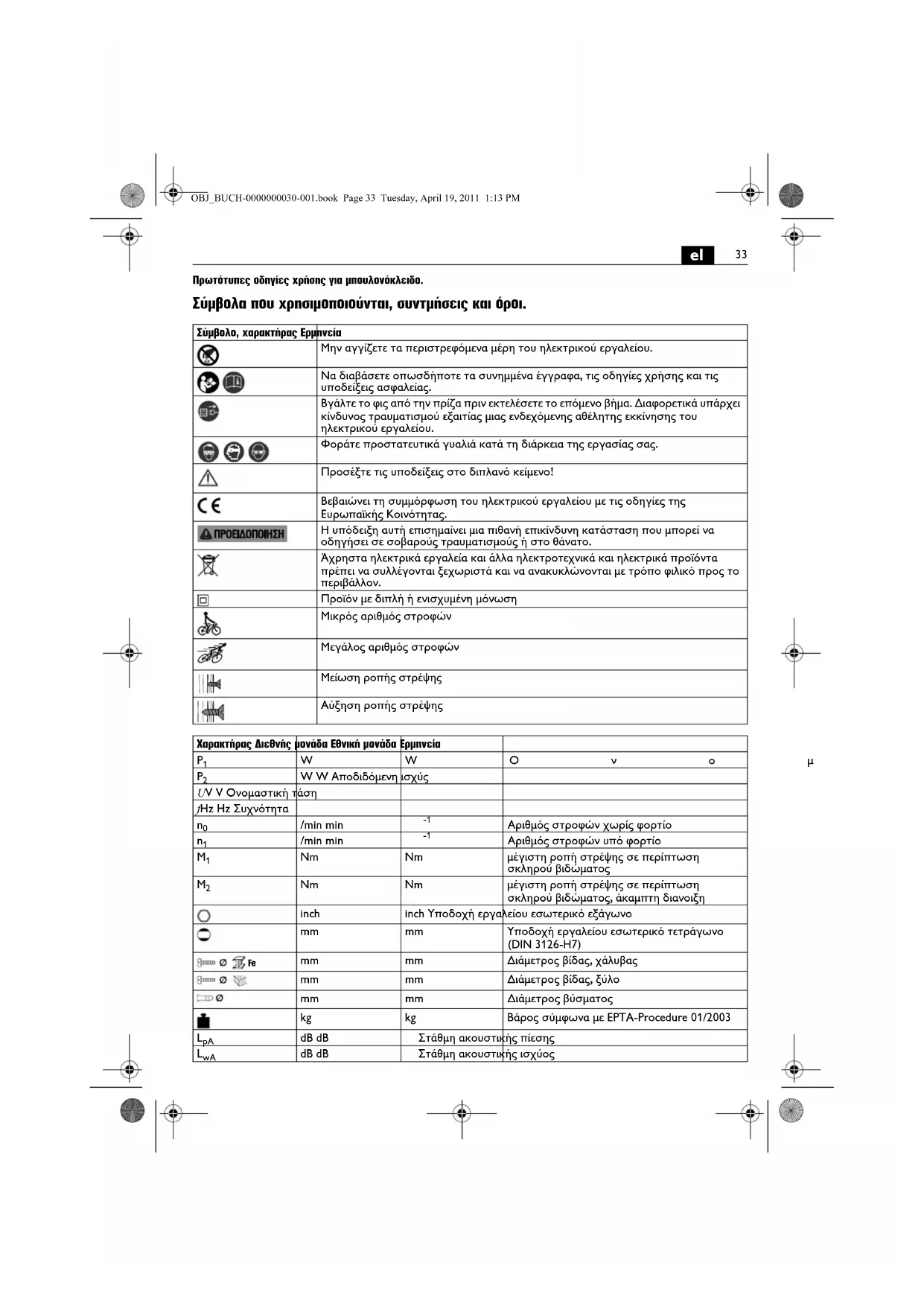 Πρωτότυπες οδηγίες χρήσης για μπουλονόκλειδο. Σύμβολα που χρησιμοποιούνται, συντμήσεις και όροι. Σύμβολο, χαρακτήρας Ερμηνεία Μην αγγίζετε τα περιστρεφόμενα μέρη του ηλεκτρικού εργαλείου. Να διαβάσετε οπωσδήποτε τα συνημμένα έγγραφα, τις οδηγίες χρήσης και τις υποδείξεις ασφαλείας. Βγάλτε το φις από την πρίζα πριν εκτελέσετε το επόμενο βήμα. Διαφορετικά υπάρχει κίνδυνος τραυματισμού εξαιτίας μιας ενδεχόμενης αθέλητης εκκίνησης του ηλεκτρικού εργαλείου. Φοράτε προστατευτικά γυαλιά κατά τη διάρκεια της εργασίας σας. Προσέξτε τις υποδείξεις στο διπλανό κείμενο! Βεβαιώνει τη συμμόρφωση του ηλεκτρικού εργαλείου με τις οδηγίες της Ευρωπαϊκής Κοινότητας. Η υπόδειξη αυτή επισημαίνει μια πιθανή επικίνδυνη κατάσταση που μπορεί να οδηγήσει σε σοβαρούς τραυματισμούς ή στο θάνατο. Άχρηστα ηλεκτρικά εργαλεία και άλλα ηλεκτροτεχνικά και ηλεκτρικά προϊόντα πρέπει να συλλέγονται ξεχωριστά και να ανακυκλώνονται με τρόπο φιλικό προς το περιβάλλον. Προϊόν με διπλή ή ενισχυμένη μόνωση Μικρός αριθμός στροφών Μεγάλος αριθμός στροφών Μείωση ροπής στρέψης Αύξηση ροπής στρέψης Χαρακτήρας Διεθνής μονάδα Εθνική μονάδα Ερμηνεία