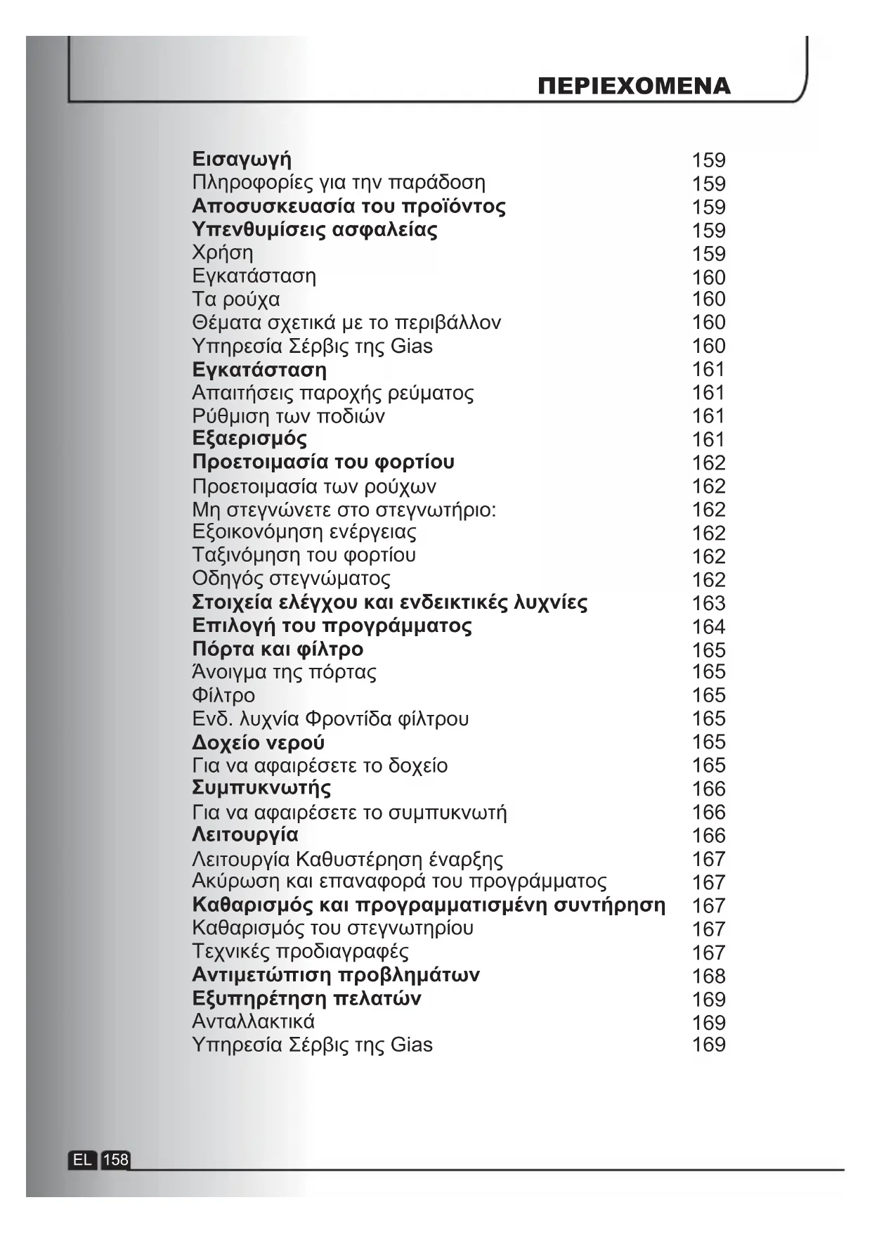 στεγνωτήριο πρέπει να κάνετε ιδιαίτερη προσοχή !EL 168ΣΗΜΑΝΤΙΚΟ Πάντα απενεργοποιείτε τη συσκευή και αφαιρείτε το φις από την παροχή ρεύματος πριν καθαρίσετε τη συσκευή.Για τα ηλεκτρικά χαρακτηριστικά ανατρέξτε στην πινακίδα στοιχείων στο μπροστινό μέρος του περιβλήματος του στεγνωτηρίου (με την πόρτα ανοικτή). Τεχνικές προδιαγραφές