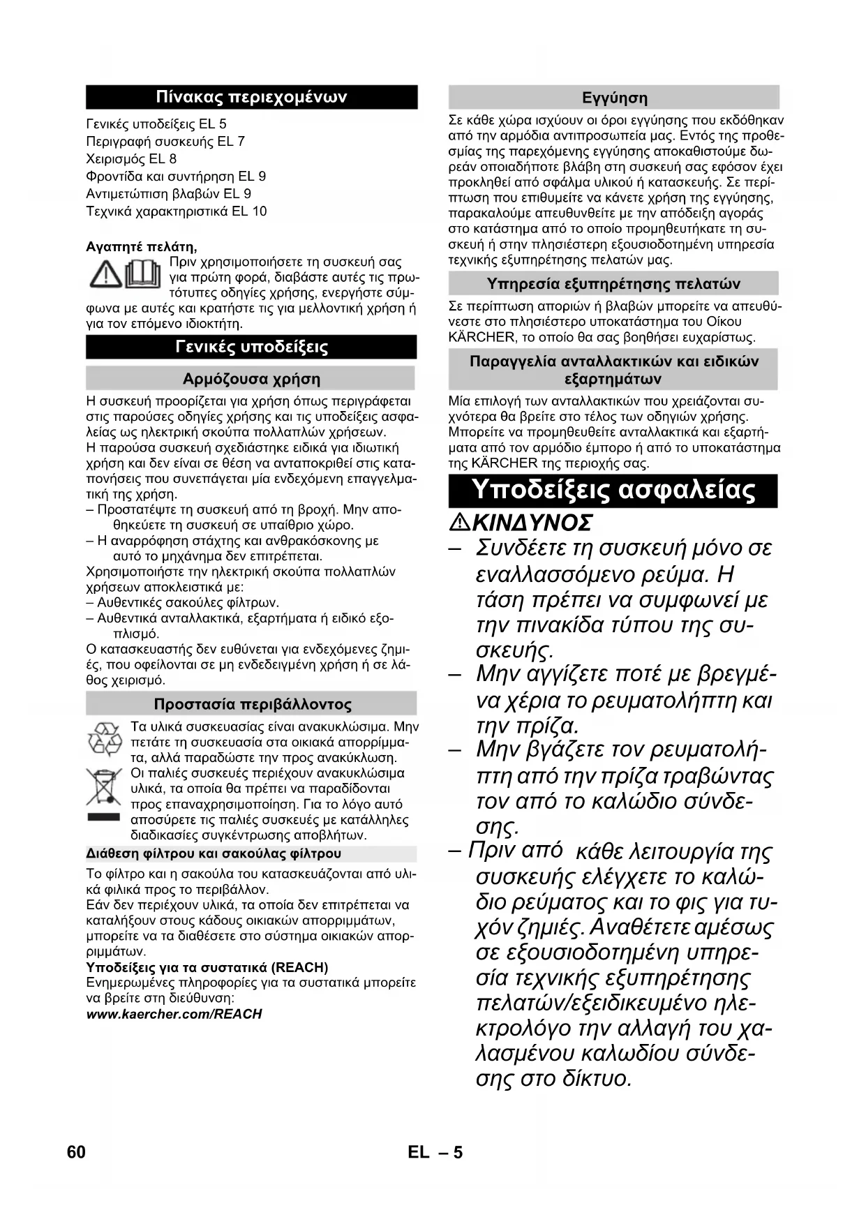 Υπηρεσία εξυπηρέτησης πελατών Παραγγελία ανταλλακτικών και ειδικών εξαρτημάτων Υποδείξεις ασφαλείας 60 EL– 6 – Για την αποφυγή ηλεκτρικών ατυχημάτων, συνιστάται η χρήση πριζών με προεγκατε- στημένο προστατευτικό δια- κόπτη ρεύματος διαρροής (μέγ. 30 mA ονομαστική ισχύς ρεύματος απεμπλο-