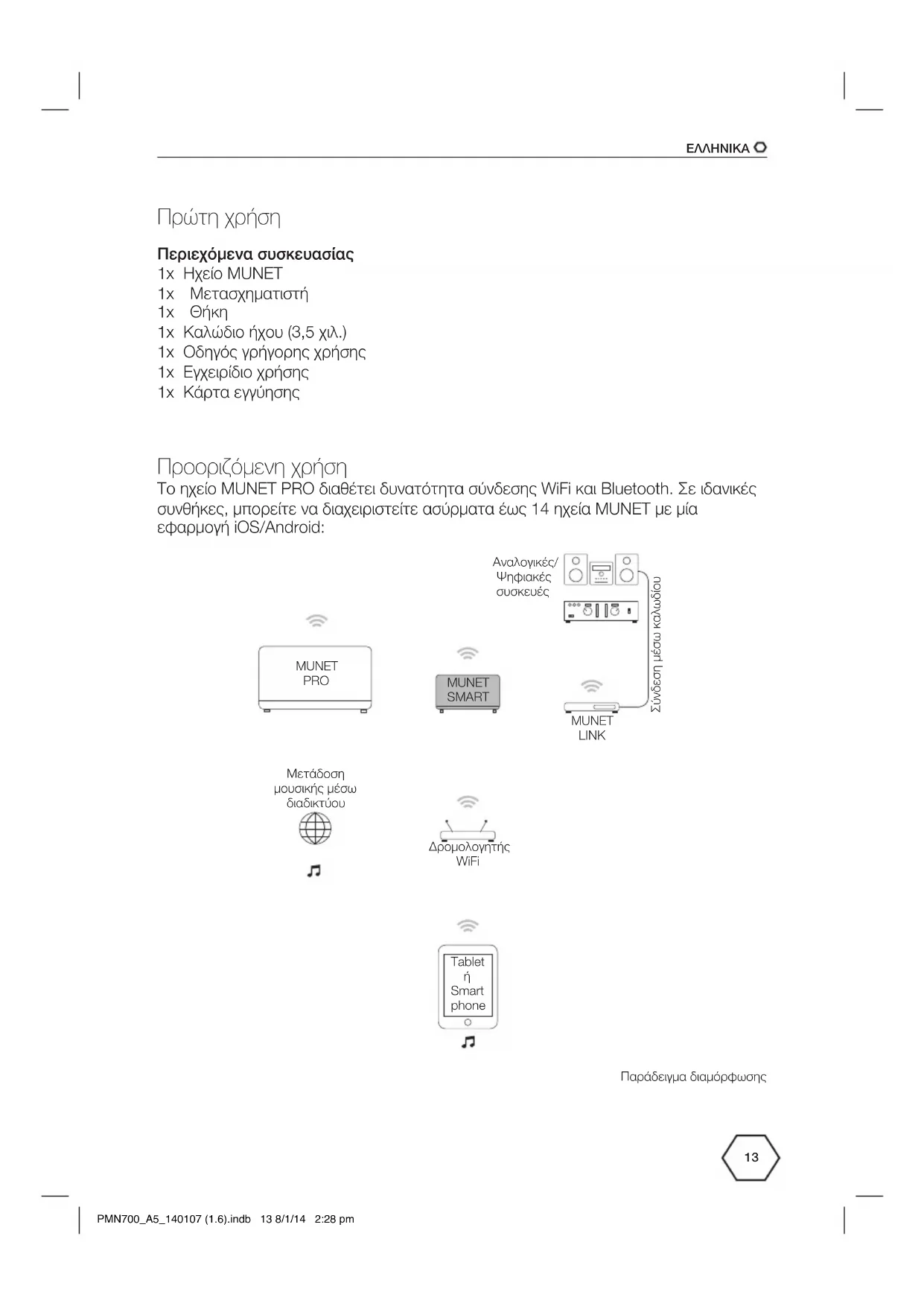 Πρώτη χρήση Περιεχόμενα συσκευασίας 1x Ηχείο MUNET 1x Μετασχηματιστή 1x Θήκη 1x Καλώδιο ήχου (3,5 χιλ.) 1x Οδηγός γρήγορης χρήσης 1x Εγχειρίδιο χρήσης 1x Κάρτα εγγύησης Προοριζόμενη χρήση Το ηχείο MUNET PRO διαθέτει δυνατότητα σύνδεσης WiFi και Bluetooth. Σε ιδανικές συνθήκες, μπορείτε να διαχειριστείτε ασύρματα έως 14 ηχεία MUNET με μία εφαρμογή iOS/Android: Tablet