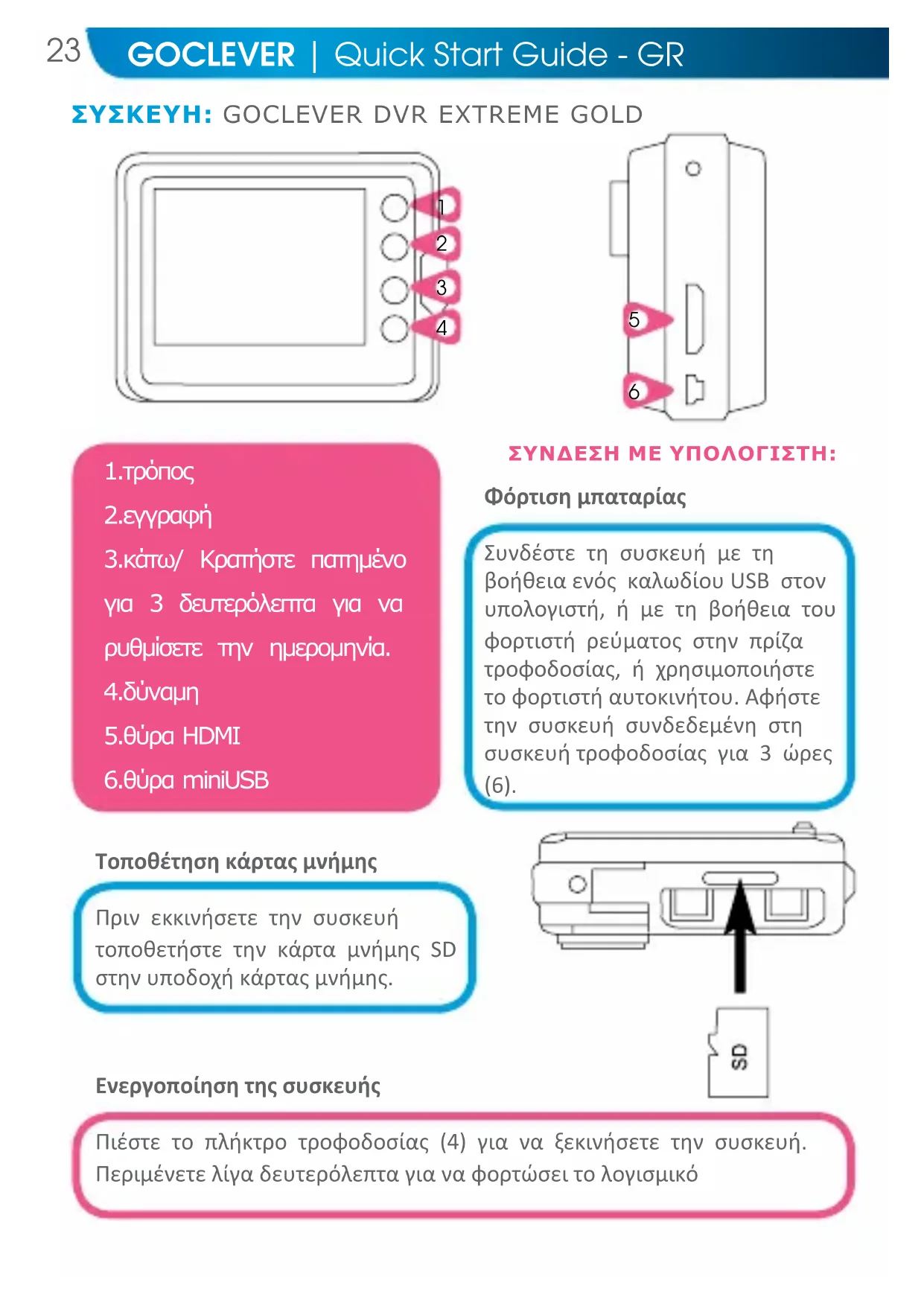 Το πλήρες έγγραφο με λεπτομερείς πληροφορίες διατίθεται στην ηλεκτρονική μας διεύθυνση: www.goclever.com στον σελιδοδείκτη που αφορά το παρόν προϊόν στον κατάλογο προϊόντων. Το αρχείο Pdf με την δήλωση CE βρίσκεται ανάμεσα στους σελιδοδείκτες. Αυτό το προϊόν υπόκειται στην οδηγία RoHS ΣΗΜΑ ΠΟΙΟΤΗΤΑΣ - ΟΥΚΡΑΝΙΑ Το εθνικό σήμα ποιότητας πιστοποιεί,ότι το προϊόν είναι σύμφωνο με τις απαιτήσεις της ουκρανικής τεχνικής νομοθεσίας. ΑΠΟΡΡΙΨΗ ΚΑΙ ΑΝΑΚΥΚΛΩΣΗ Σύμφωνα με την νομοθεσία της Ευρωπαϊκής Ένωσης (Waste Electrical and Elec- tronic Equipment - ή WEEE - οδηγία 2002/96/EG) όλα τα ηλεκτρονικά προϊόντα, όπως και οι κάμερες GOCLEVER, πρέπει να ανακυκλώνονται δωρεάν σε ειδικούς χώρους που έχουν σχεδιαστεί για το σκοπό αυτό στην περιοχή σας. Οι χρήστες υποχρεούνται να παραδώσουν τον παλιό ή χαλασμένο ηλεκτρικό και ηλεκτρονικό εξοπλισμό στις δημόσιες εγκαταστάσεις ανακύκλωσης απορριμάτων ή στα σημεία πώλησης. Θα πρέπει να ληφθεί υπόψη το γεγονός, ότι όλες αυτές οι συσκευές και τα καλώδιά τους, τυγχάνουν περαιτέρω επεξεργασίας κατά την διαδικασία ανακύκλωσης, γι’ αυτό το λόγο όλα τα ηλεκτρικά και ηλεκτρονικά προϊόντα πρέπει να σημειώνονται με ειδικό σύμβολο. ΑΝΑΚΥΚΛΩΣΗ ΑΧΡΗΣΤΩΝ ΜΠΑΤΑΡΙΩΝ (ΑΦΟΡΑ ΤΗΝ ΕΥΡΩΠΑϊΚΗ ΕΝΩΣΗ ΚΑθΩΣ ΚΑΙ ΑΛΛΕΣ ΕΥΡΩΠΑϊΚΕΣ ΧΩΡΕΣ ΠΟΥ ΚΑΤΕΧΟΥΝ ξΕΧΩΡΙΣΤΑ ΣΥΣΤΗΜΑΤΑ ΑΝΑΚΥΚΛΩΣΗΣ) Αυτή η ένδειξη μπορεί να εμφανιστεί πάνω στην μπαταρία ή στην συσκευασία της, υποδεικνύοντας ότι μπαταρία που παρέχεται με το προϊόν δεν πρέπει να αντιμετωπίζεται ως οικιακό απόρριμμα. Σε ορισμένα είδη μπαταριών, η ένδειξη αυτή μπορεί να χρησιμοποιείται μαζί με το χημικό σύμβολο (στοιχείο) του υδράργυρου (Hg) ή του μόλυβδου (Pb), εάν η μπαταρία περιέχει ποσότητες μεγαλύτερες από 0,0005% για τον υδράργυρο ή 0,004% για τον μόλυβδο. Με τη σωστή απόρριψη τέτοιους είδους μπαταριών βοηθάτε στην αποφυγή πιθανών αρνητικών επιπτώσεων στο φυσικό περιβάλλον καθώς και στην ανθρώπινη υγεία. Ενδεικνύεται ο διαχωρισμός των απορριμάτων και η υπεύθυνη ανακύκλωση που προωθεί την επαναχρησιμοποίηση των υλικών πόρων. Σε περιπτώσεις συσκευών, οι οποίες για λόγους ασφαλείας, αποδοτικότητας ή ασφάλειας δεδομένων, απαιτούν συνεχή σύνδεση με ενσωματωμένη μπαταρία, οι μπαταρίες αυτές θα έπρεπε να αντικαθίστανται μόνο από εξειδικευμένο προσωπικό. Σας παρακαλούμε να παραδίδετε τις μπαταρίες στα κατάλληλα σημεία ανακύκλωσης. ΣΥΝΔΕΣΗ ΜΕ ΥΠΟΛΟΓΙΣΤΗ: Συνδέστε ένα καλώδιο miniUSB στον υπολογιστή. Στην συσκευή θα εμφανιστεί η οθόνη καλωσορίσματος καθώς και θα ανάψει η φωτεινή ένδειξη LED. Επιλέξτε την επιλογή μνήμη μαζικής αποθήκευσης στον υπολογιστή, για να αποκτήσετε πρόσβαση στα περιεχόμενα της κάρτας μνήμης της συσκευής. Αποσυνδέστε το καλώδιο USB, για να απενεργοποιήσετε την συσκευή. Σημείωση: Σε περίπτωση που η συσκευή σας „κολλήσει”, χρησιμοποιήστε το πλήκτρο επαναφοράς. ΑΠΑΙΤΗΣΕΙΣ ΣΥΣΤΗΜΑΤΟΣ: Windows 2000/XP/Vista/7, Mac OS 10.3.6 ή νεώτερο.26 GOCLEVER | Quick Start Guide - HU 1.Mód 2.Felvétel 3.Lefelé/ Tartsa 3 má- sodpercig állítsa be a dátumot. 4.Hatalom 5.HDMI port 6.MiniUSB port KÉSZÜLÉK: GOCLEVER DVR EXTREME GOLD Az akkumulátor töltése Csatlakoztasd a készüléket az miniUSB kábellel a számítógépre vagy a hálóza- töltővel a hálóza aljzatra vagy használd az autós töltőt. Hagyd töltőn a készüléket a 3 óráig (6). KEZELÉS: A memóriakártya behelyezése A készülék bekapcsolása elő helyezd be a SD memóriakár- tyát a memóriakártya aljzatba. A készülék bekapcsolása Nyomd meg a kapcsológombot (4) a készülék bekapcsolásához. Várj néhány másodpercet a szover betöltésére.