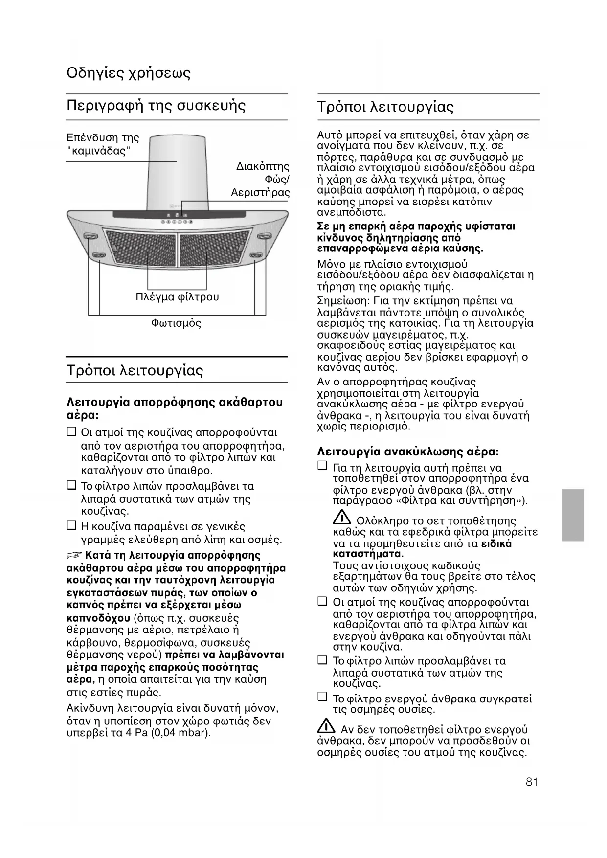 Σπουδαίες υποδείξεις: ❑ Tο παρν εγχειρίδιο οδηγιών χρήσηςισχύει για διάφορα µοντέλα τηςσυσκευής. Eνδέχεται ορισµέναµεµονωµένα χαρακτηριστικά του εξο-πλισµού που περιγράφονται να µηναφορούν τη δική σας συσκευή.❑ Αυτς ο απορροφητήρας κουζίναςανταποκρίνεται στους σχετικούςκανονισµούς ασφαλείας.Οι επισκευές επιτρέπεται ναεκτελούνται µνον απ τους ειδικούς.$ταν δεν γίνονται σωστά οι επισκευές,είναι δυνατν να προκύψουν σοβαρέςζηµιές για τον χρήστη. Μην παρασκευάζετε ποτέ φλαµπέ φαγητών κάτω απ τον απορροφητήρακουζίνας.Κίνδυνος να πάρει φωτιά το φίλτρο ! λιπών απ τις ανερχµενες φλγες.