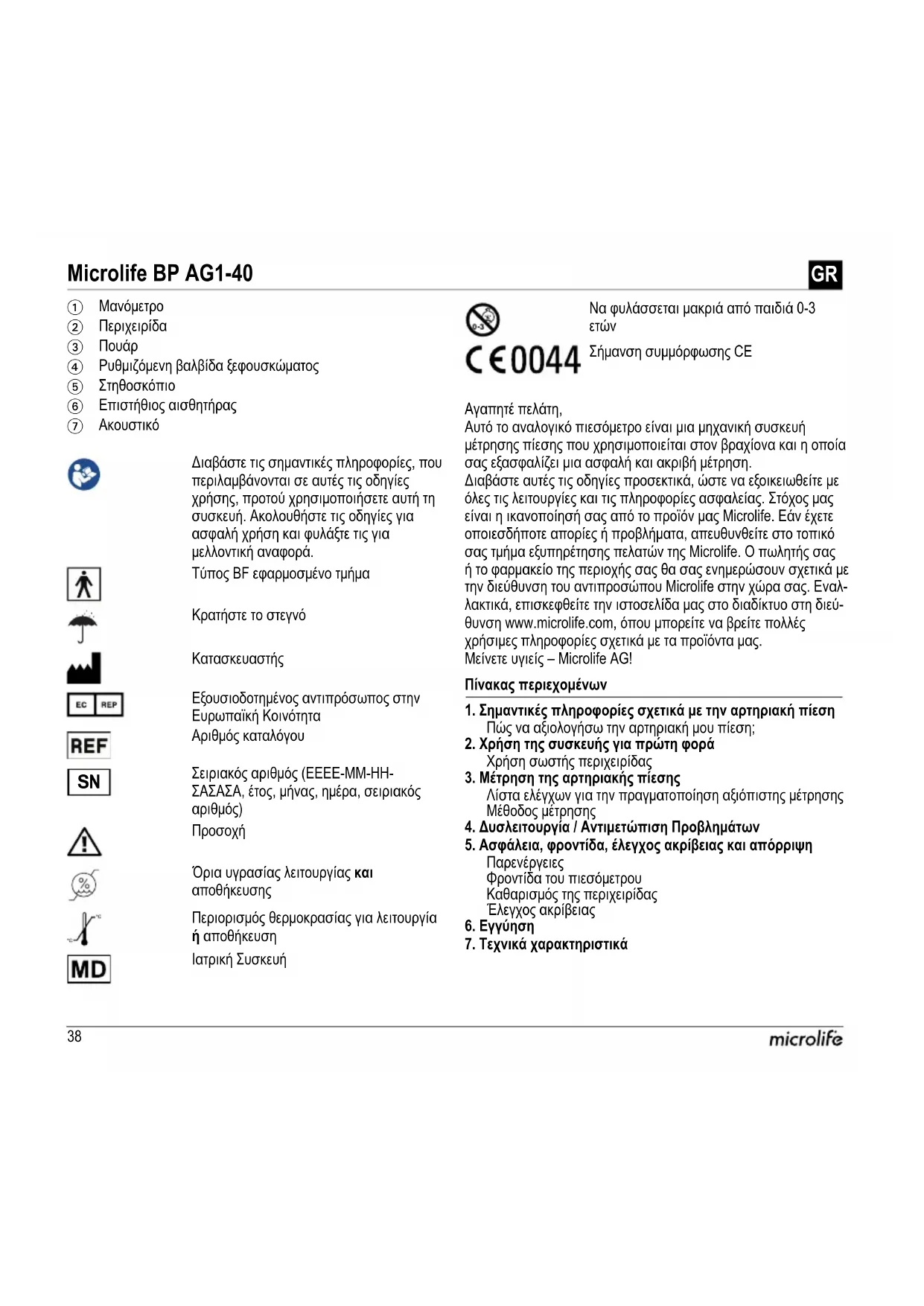Αγαπητέ πελάτη, Αυτό το αναλογικό πιεσόμετρο είναι μια μηχανική συσκευή μέτρησης πίεσης που χρησιμοποιείται στον βραχίονα και η οποία σας εξασφαλίζει μια ασφαλή και ακριβή μέτρηση. Διαβάστε αυτές τις οδηγίες προσεκτικά, ώστε να εξοικειωθείτε με όλες τις λειτουργίες και τις πληροφορίες ασφαλείας. Στόχος μας είναι η ικανοποίησή σας από το προϊόν μας Microlife. Εάν έχετε οποιεσδήποτε απορίες ή προβλήματα, απευθυνθείτε στο τοπικό σας τμήμα εξυπηρέτησης πελατών της Microlife. Ο πωλητής σας ή το φαρμακείο της περιοχής σας θα σας ενημερώσουν σχετικά με την διεύθυνση του αντιπροσώπου Microlife στην χώρα σας. Εναλ- λακτικά, επισκεφθείτε την ιστοσελίδα μας στο διαδίκτυο στη διεύ- θυνση www.microlife.com, όπου μπορείτε να βρείτε πολλές χρήσιμες πληροφορίες σχετικά με τα προϊόντα μας. Μείνετε υγιείς – Microlife AG! Πίνακας περιεχομένων