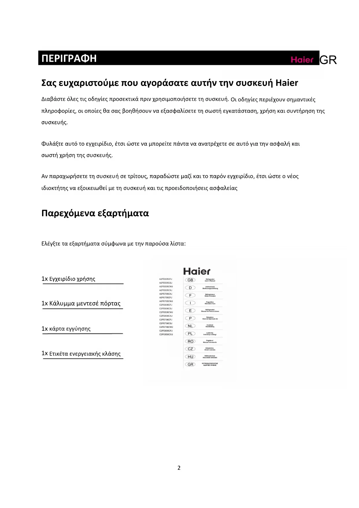 Σας ευχαριστούμε που αγοράσατε αυτήν την συσκευή Haier