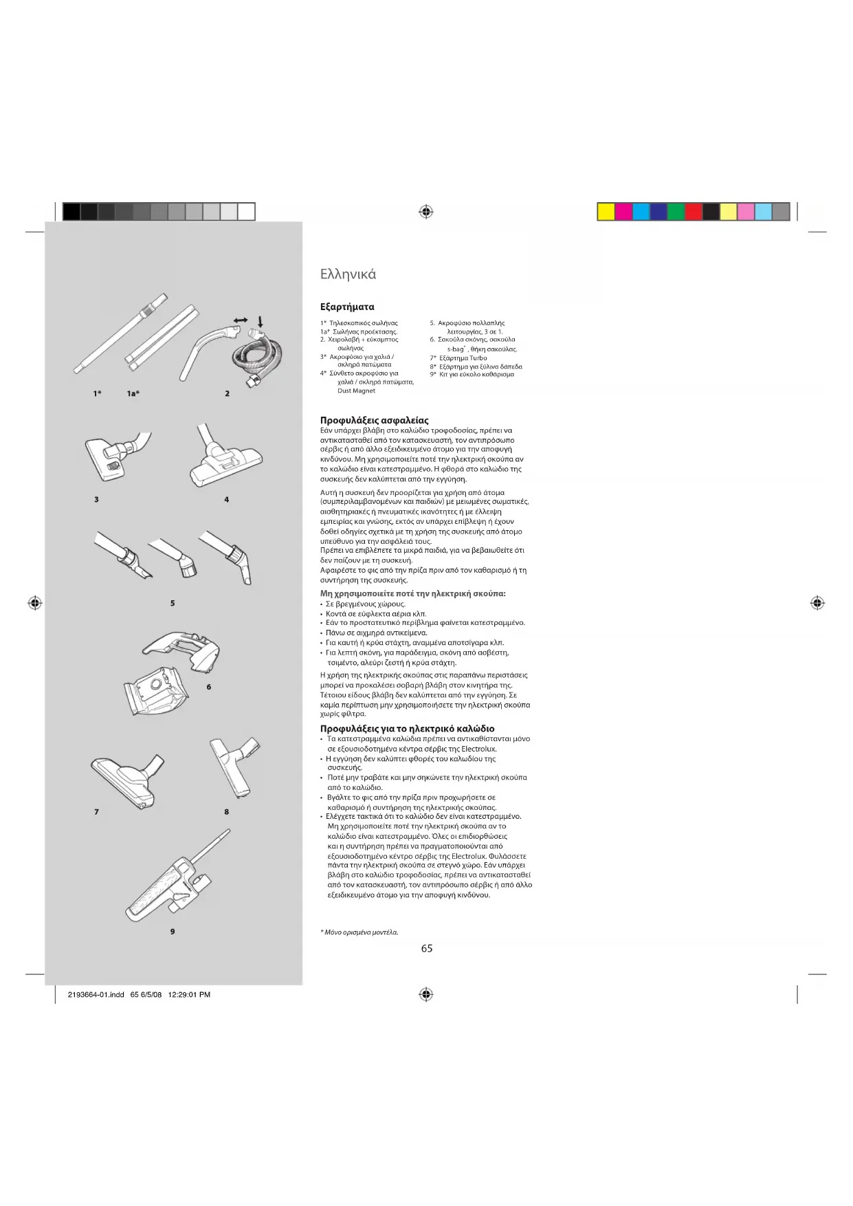 Ελληνικά 1* Τηλεσκοπικός σωλήνας1a* Σωλήνας προέκτασης.2. Χειρολαβή + εύκαμπτος σωλήνας3* Ακροφύσιο για χαλιά / σκληρά πατώματα4* Σύνθετο ακροφύσιο για χαλιά / σκληρά πατώματα, Dust Magnet5. Ακροφύσιο πολλαπλής λειτουργίας, 3 σε 1.6. Σακούλα σκόνης, σακούλα s-bag ® , θήκη σακούλας.7* Εξάρτημα Turbo 8* Εξάρτημα για ξύλινα δάπεδα9* Κιτ για εύκολο καθάρισμα* Μόνο ορισμένα μοντέλα. 2193664-01.indd 65 6/5/08 12:29:01 PM65