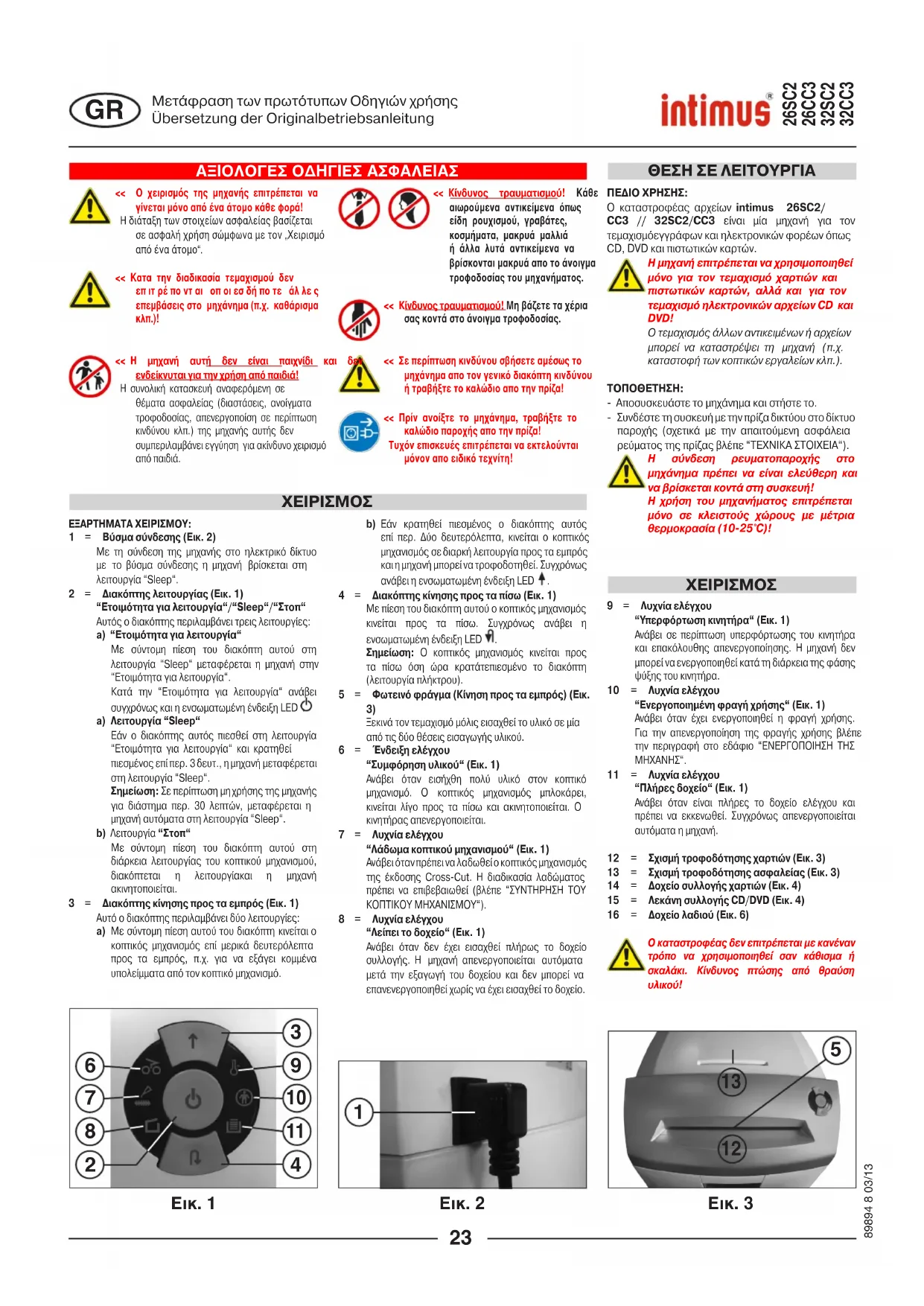 Åéê. 1 Åéê. 4 Mετάφραση των πρωτότυπων Οδηγιών χρήσηςÜbersetzung der Originalbetriebsanleitung- Τώρα τροφοδοτείται ο μηχανισμός με το υπόλοιπο υλικό, το οπιό τεμαχίζεται.- Η λυχνία ελέγχου (6) σβήνει. Η ένδειξη LED του διακόπτη κίνησης προς τα εμπρός (3) παραμένιε συνεχώς αναμμένη.- Όταν πέρασε το υλικό, συνεχίστε τον τεμαχισμό με τη σωστή δοσολογία.- Εάν καταστεί απαραίτητο, ρυθμίστε χειροκίνητα το μηχανισμό κοπής εναλλάξ με κίνηση μιά προς τα εμπρός και μια προς τα πίσω, μέχρι να περάσει και να τεμαχιστεί όλο το υλικό.Σε κάθε αλλαγή της κατεύθυνσης να περιμένετε την ακινητοποίηση του κινητήρα!ΠΡΟΣΤΑΣΙΑΤΟΥΚΙΝΗΤΗΡΑ:Σε περίπτωση υπερφόρτωσης του κινητήρα, ο κινητήρας απενεργοποιείται. Η λυχνία ελέγχου (9) αναβοσβήνει. Απενεργοποιήστε τη μηχανή με τον διακόπτη πλήκτρου (1).Μετά από χρόνο ψύξης περ. 25-40 λεπτών (ανάλογα με το μοντέλο και τη θερμοκρασία του χώρου) μπορείτε να επανενεργοποιήσετε τη συσκευή.ΣΥΜΦΟΡΗΣΗΥΛΙΚΟΥΣΤΗΣΥΣΚΕΥΗ:(ΛειτουργίαAuto-Reverse)Εάν από μεγάλη ποσότητα τροφοδότησης υλικού προκύψει συμφόρηση, η μηχανή αντιδρά ως ακολούθως:- Ο κοπτικός μηχανισμός μπλοκάρει, κινείται λίγο προς τα πίσω (το υλικό ελευθερώνεται) και ακινητοποιείται. Ο κινητήρας σβήνει.- Ανάβει η λυχνία ελέγχου (6).Ακολουθήστε τα εξής βήματα:Συµφόρησηυλικούστηθήκηπροσαγωγήςχαρτιού(12)- Αφαιρέστε από τη θήκη προσαγωγής το χαρτί που οδηγήθηκε προς τα πίσω (12).- Τώρα ο κοπτικός μηχανισμός κινείται αυτόματα προς τα εμπρός και τεμαχίζει τα υπολείμματα χαρτιού στον κοπτικό μηχανισμό.- Η λυχνία ελέγχου (6) σβήνει. Η ένδειξη LED του πλήκτρου για κίνηση προς τα εμπρός (3) είναι συνεχώς αναμμένη.- Συνεχίστε τον τεμαχισμό με μικρότερη ποσότητα χαρτιών. Συµφόρηση υλικού στη θήκη τροφοδότησης ασφαλείας (13) - Αφαιρέστε το υλικό που επεστράφη.Να αφαιρείτε το υλικό προσεκτικά προσεκτικά λόγω του κινδύνου τραυματισμού από αιχμηρές γωνίες!ΛΙΣΤΑΕΛΕΓΧΟΥΣΕΠΕΡΙΠΤΩΣΗΒΛΑΒΗΣ:Εάν δεν λειτουργεί η συσκευή, ελέγξτε τα εξής:- Είναι συνδεδεμένο το βύσµαδικτύου με το δίκτυο;- Βρίσκεται η συσκευή στη λειτουργία “Sleep“; Βλέπε “ΑΥΤΟΜΑΤΟ ΣΥΣΤΗΜΑ ΕΞΟΙΚΟΝΟΜΗΣΗΣ ΕΝΕΡΓΕΙΑΣ“.- Έχει ενεργοποιηθεί η φραγήχρήσης; Βλέπε “ΧΡΗΣΗ ΤΗΣ ΦΡΑΓΗΣ ΧΡΗΣΗΣ“.- Έχει μπει μέσα το δοχείοσυλλογής;- Είναι γεμάτο το δοχείοσυλλογής; Ακολουθήστε τις οδηγίες “EΚΚΕΝΩΣΗ ΤΟΥ ΔΟΧΕΙΟΥ ΣΥΛΛΟΓΗΣ“.- Υπάρχεισυµφόρησηυλικού στη συσκευή; Ακολουθήστε τις οδηγίες “ΣΥΜΦΟΡΗΣΗ ΥΛΙΚΟΥ ΣΤΗ ΣΥΣΚΕΥΗ“.- Έχει υπερφορτωθείο κινητήρας; Βλέπε “ΠΡΟΣΤΑΣΙΑ ΤΟΥ ΚΙΝΗΤΗΡΑ“. Εάν δεν είναι σωστό κανένα από τα εδάφια της λίστας ελέγχου,ενηµερώστετοειδικόσαςκατάστηµα. 26SC2 26CC3 32SC2 32CC3