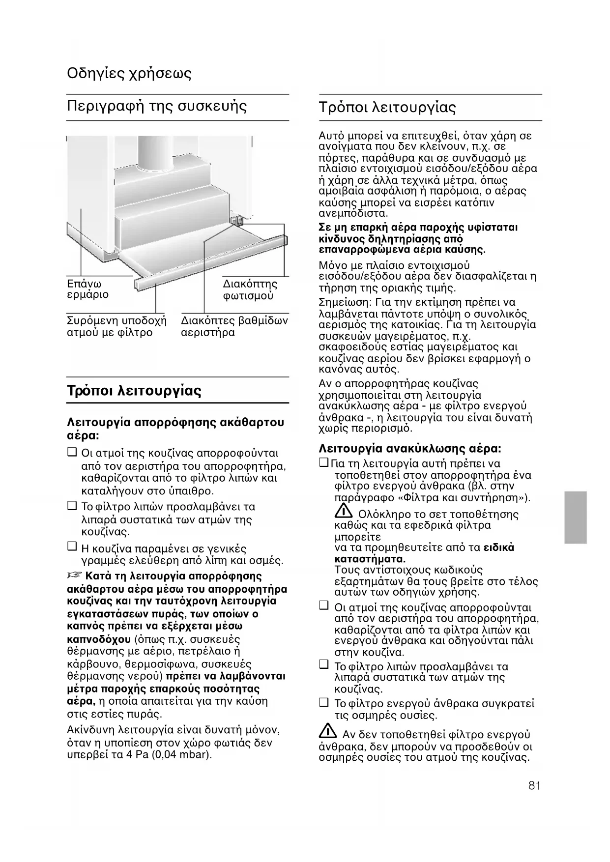 Σπουδαίες υποδείξεις: ❑ Tο παρν εγχειρίδιο οδηγιών χρήσηςισχύει για διάφορα µοντέλα τηςσυσκευής. Eνδέχεται ορισµέναµεµονωµένα χαρακτηριστικά του εξο-πλισµού που περιγράφονται να µηναφορούν τη δική σας συσκευή.❑ Αυτς ο απορροφητήρας κουζίναςανταποκρίνεται στους σχετικούςκανονισµούς ασφαλείας.Οι επισκευές επιτρέπεται ναεκτελούνται µνον απ τους ειδικούς.%ταν δεν γίνονται σωστά οι επισκευές,είναι δυνατν να προκύψουν σοβαρέςζηµιές για τον χρήστη. Μην παρασκευάζετε ποτέ φλαµπέ φαγητών κάτω απ τον απορροφητήρακουζίνας.Κίνδυνος να πάρει φωτιά το φίλτρο ! λιπών απ τις ανερχµενες φλγες.