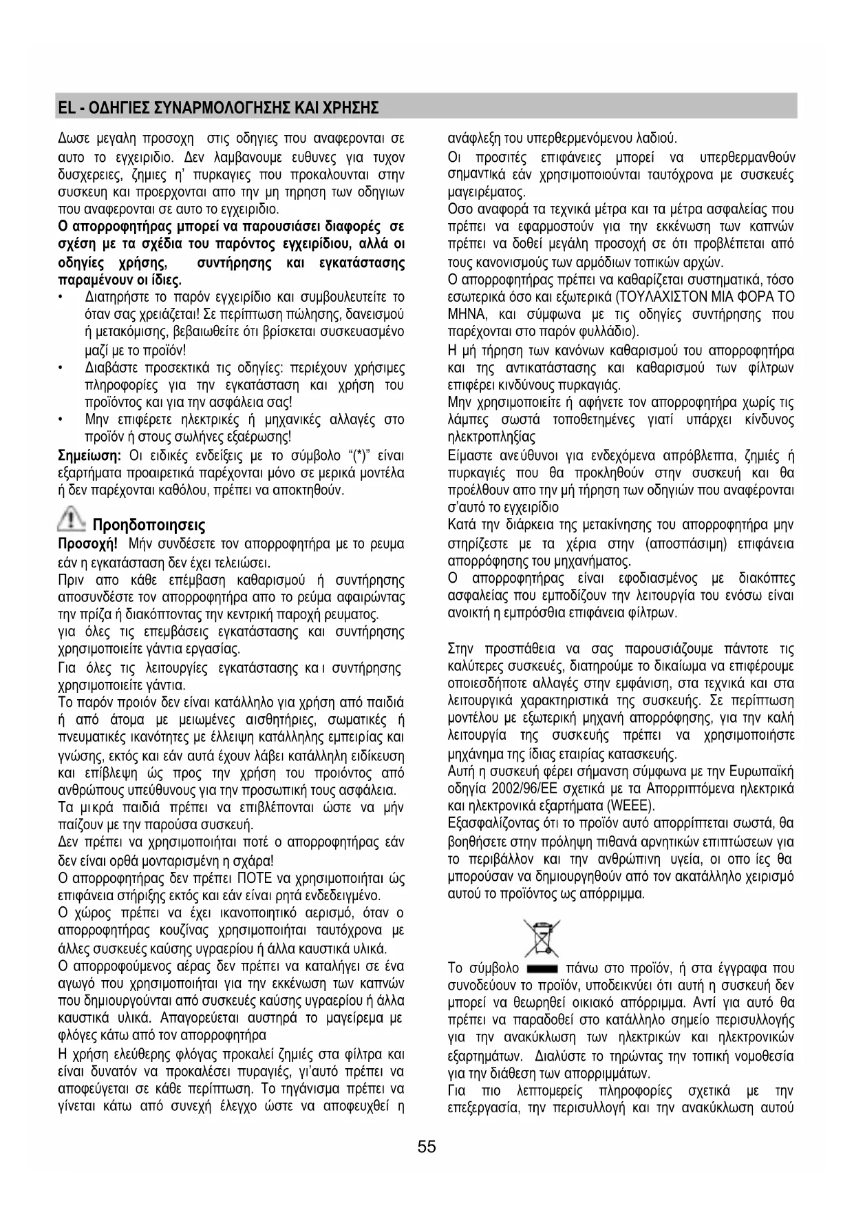 Ο απορροφητήρας δεν πρέπει ΠΟΤΕ να χρησιμοποιήται ώς