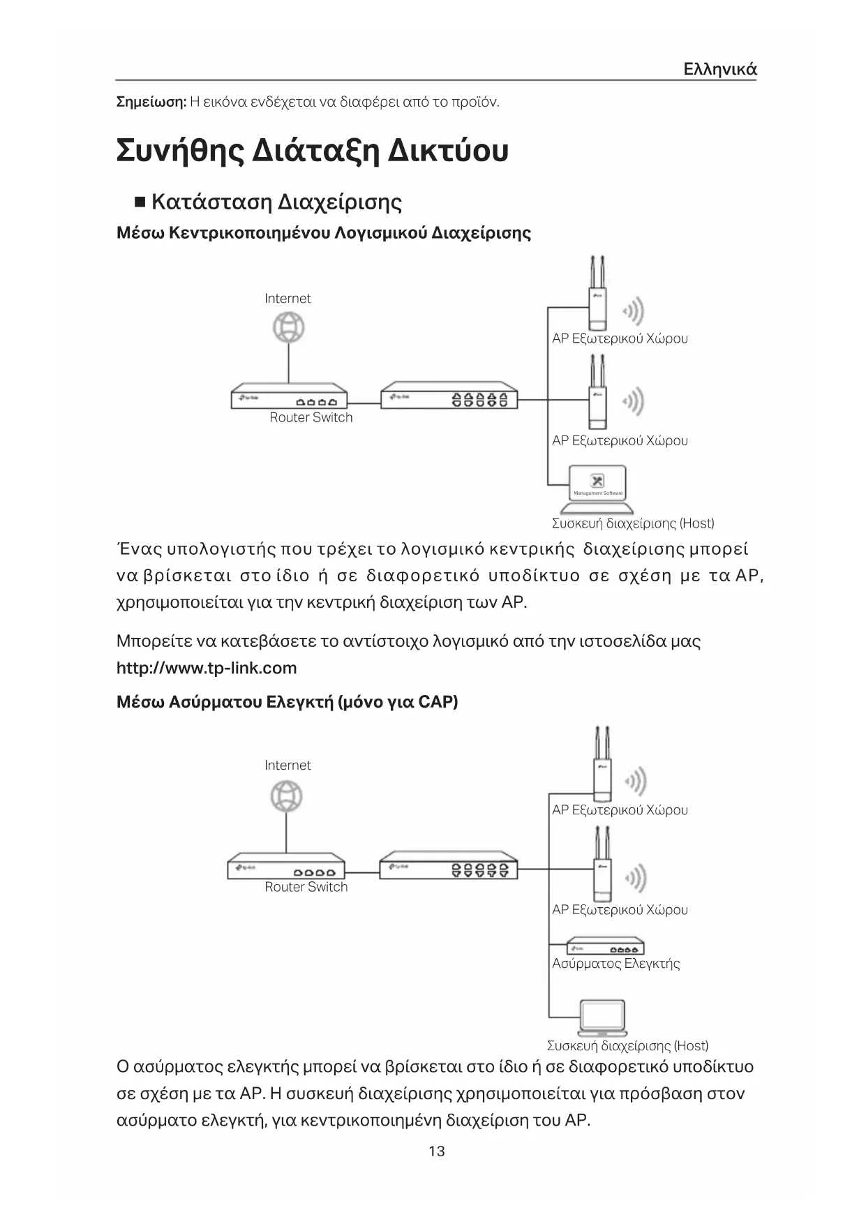 Σημείωση: Η εικόνα ενδέχεται να διαφέρει από το προϊόν. Συνήθης Διάταξη Δικτύου ■ Κατάσταση Διαχείρισης Μέσω Κεντρικοποιημένου Λογισμικού Διαχείρισης Management Software Ένας υπολογιστής που τρέχει το λογισμικό κεντρικής διαχείρισης μπορεί να βρίσκεται στο ίδιο ή σε διαφορετικό υποδίκτυο σε σχέση με τα AP, χρησιμοποιείται για την κεντρική διαχείριση των AP. Μπορείτε να κατεβάσετε το αντίστοιχο λογισμικό από την ιστοσελίδα μας http://www.tp-link.com Μέσω Ασύρματου Ελεγκτή (μόνο για CAP) Ο ασύρματος ελεγκτής μπορεί να βρίσκεται στο ίδιο ή σε διαφορετικό υποδίκτυο σε σχέση με τα AP. Η συσκευή διαχείρισης χρησιμοποιείται για πρόσβαση στον ασύρματο ελεγκτή, για κεντρικοποιημένη διαχείριση του AP. Router Switch Internet Συσκευή διαχείρισης (Host) AP Εξωτερικού Χώρου AP Εξωτερικού Χώρου Router Switch Internet AP Εξωτερικού Χώρου AP Εξωτερικού Χώρου Ασύρματος Ελεγκτής Συσκευή διαχείρισης (Host)Eλληνικά