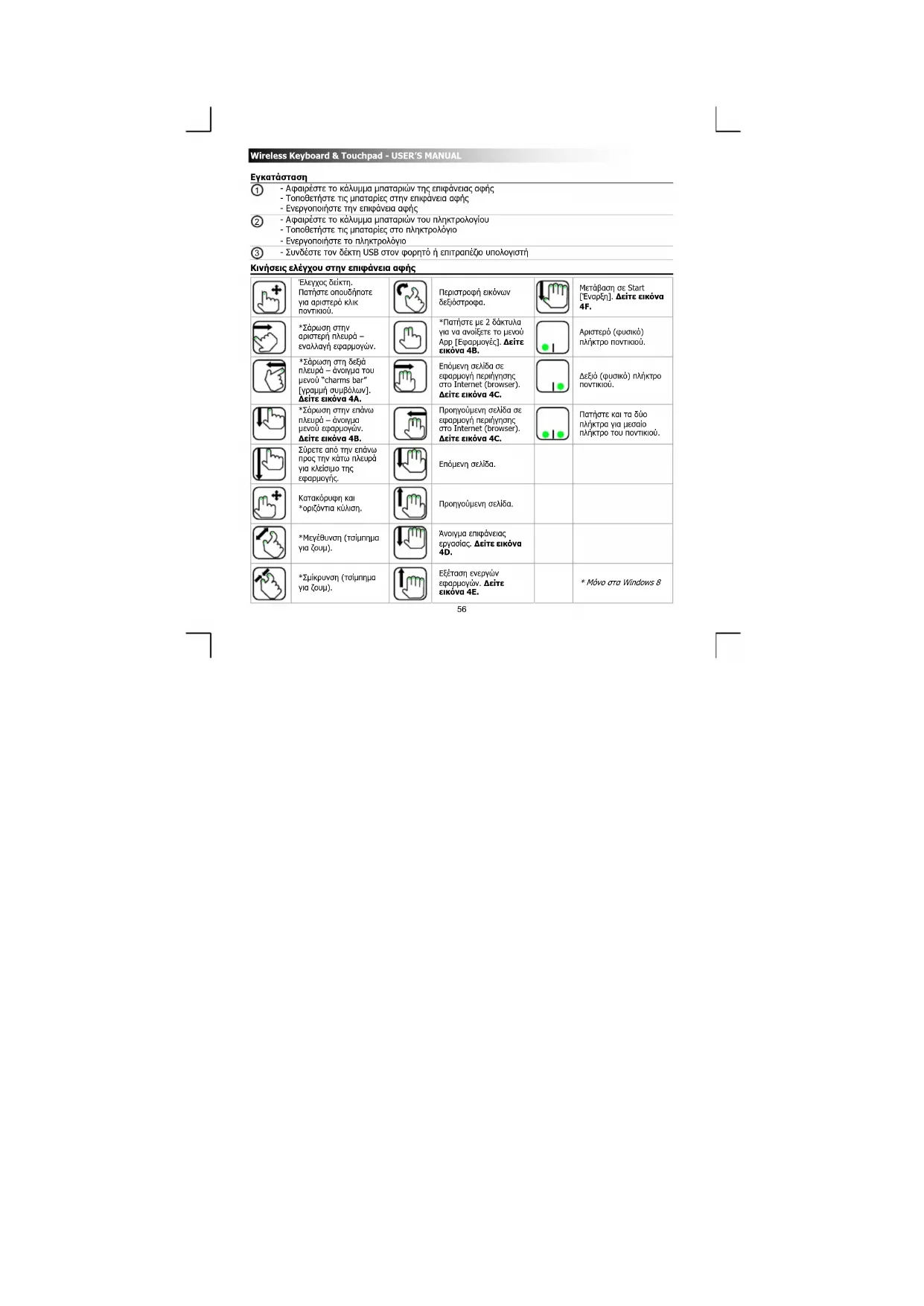 φαιρέστε το κάλυμμα μπαταριών του πληκτρολογίου - Τοποθετήστε τις μπαταρίες στο πληκτρολόγιο - Ενεργοποιήστε το πληκτρολόγιο - Συνδέστε τον δέκτη USB στον φορητό ή επιτραπέζιο υπολογιστή Κινήσεις ελέγχου στην επιφάνεια αφής