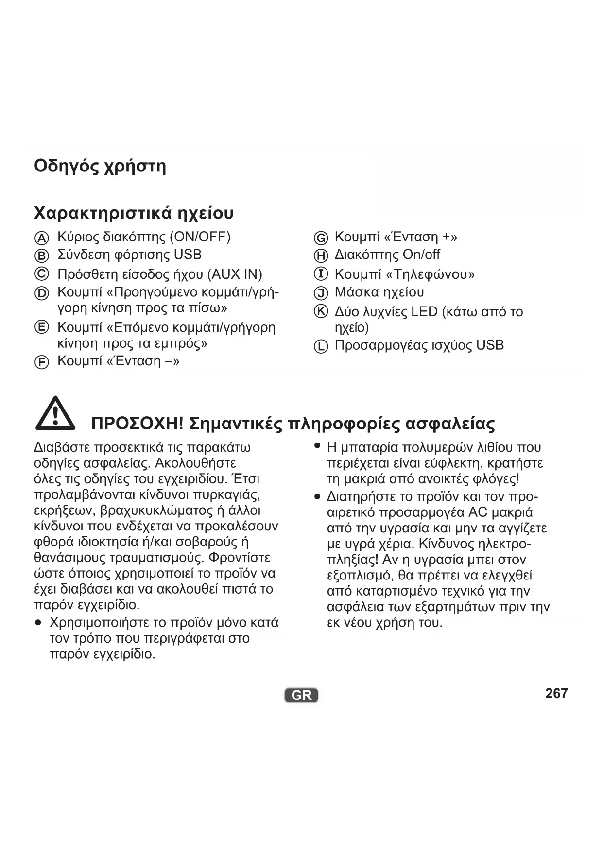 Προσαρμογέας ισχύος USB ΠΡΟΣΟΧΗ! Σημαντικές πληροφορίες ασφαλείας Διαβάστε προσεκτικά τις παρακάτω οδηγίες ασφαλείας. Ακολουθήστε όλες τις οδηγίες του εγχειριδίου. Έτσι προλαμβάνονται κίνδυνοι πυρκαγιάς, εκρήξεων, βραχυκυκλώματος ή άλλοι κίνδυνοι που ενδέχεται να προκαλέσουν φθορά ιδιοκτησία ή/και σοβαρούς ή θανάσιμους τραυματισμούς. Φροντίστε ώστε όποιος χρησιμοποιεί το προϊόν να έχει διαβάσει και να ακολουθεί πιστά το παρόν εγχειρίδιο.