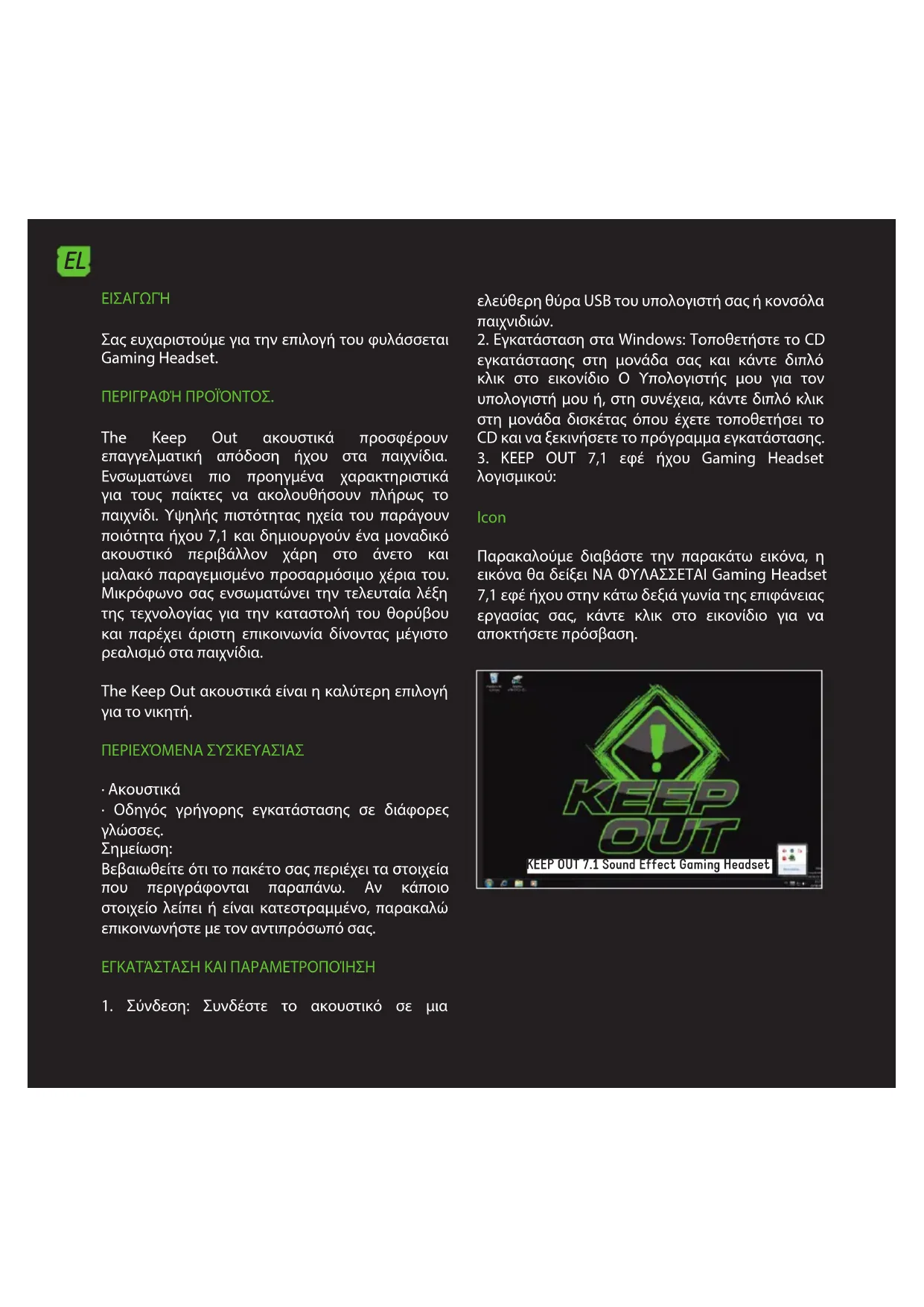 λογισμικού: Icon Παρακαλούμε διαβάστε την παρακάτω εικόνα, η εικόνα θα δείξει ΝΑ ΦΥΛΑΣΣΕΤΑΙ Gaming Headset 7,1 εφέ ήχου στην κάτω δεξιά γωνία της επιφάνειας εργασίας σας, κάντε κλικ στο εικονίδιο για να αποκτήσετε πρόσβαση. KEEP OUT 7.1 Sound Effect Gaming HeadsetEL Κύριος Διαμόρφωση: