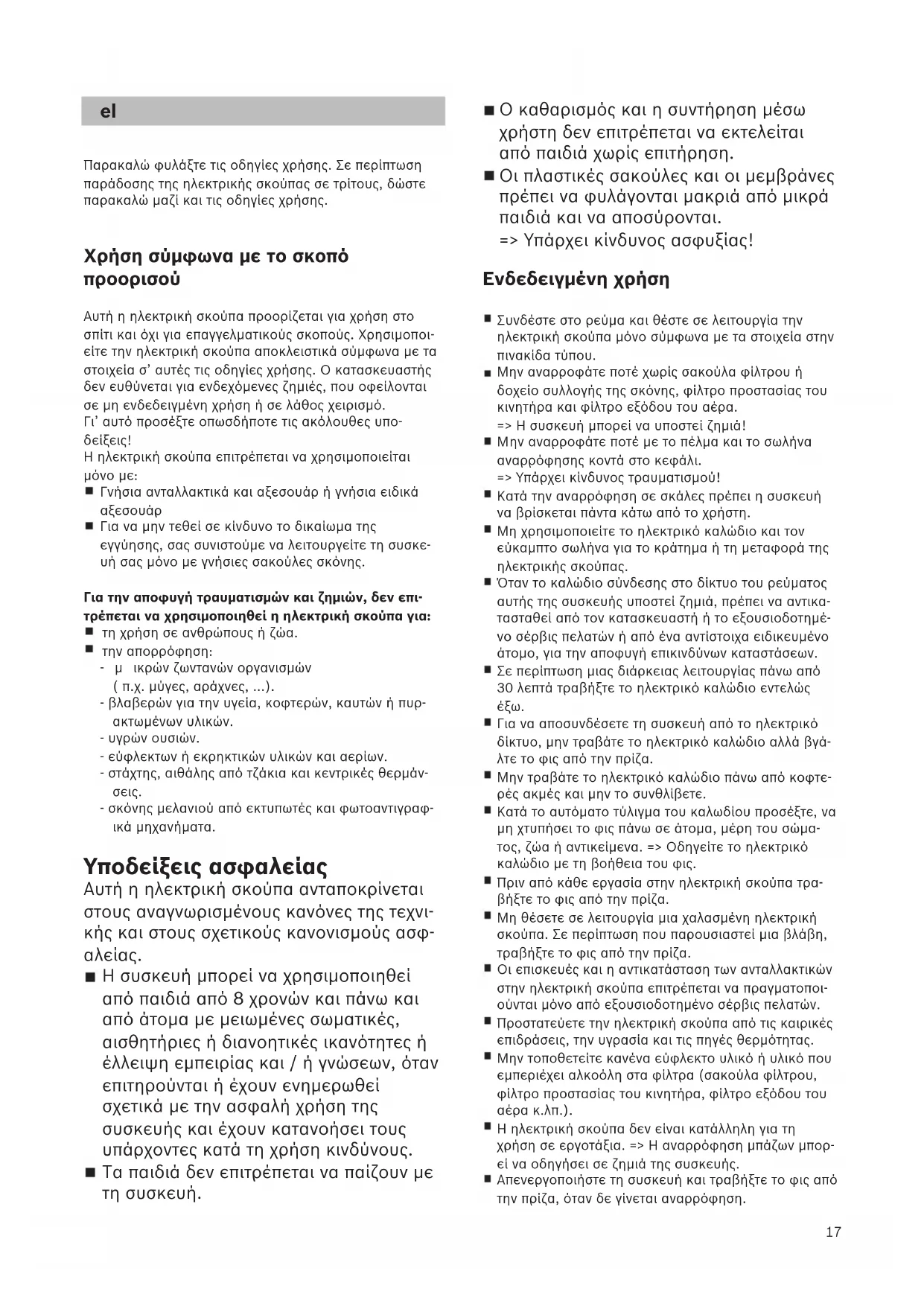 είτε την ηλεκτρική σκούπα αποκλειστικά σύµφωνα µε τα