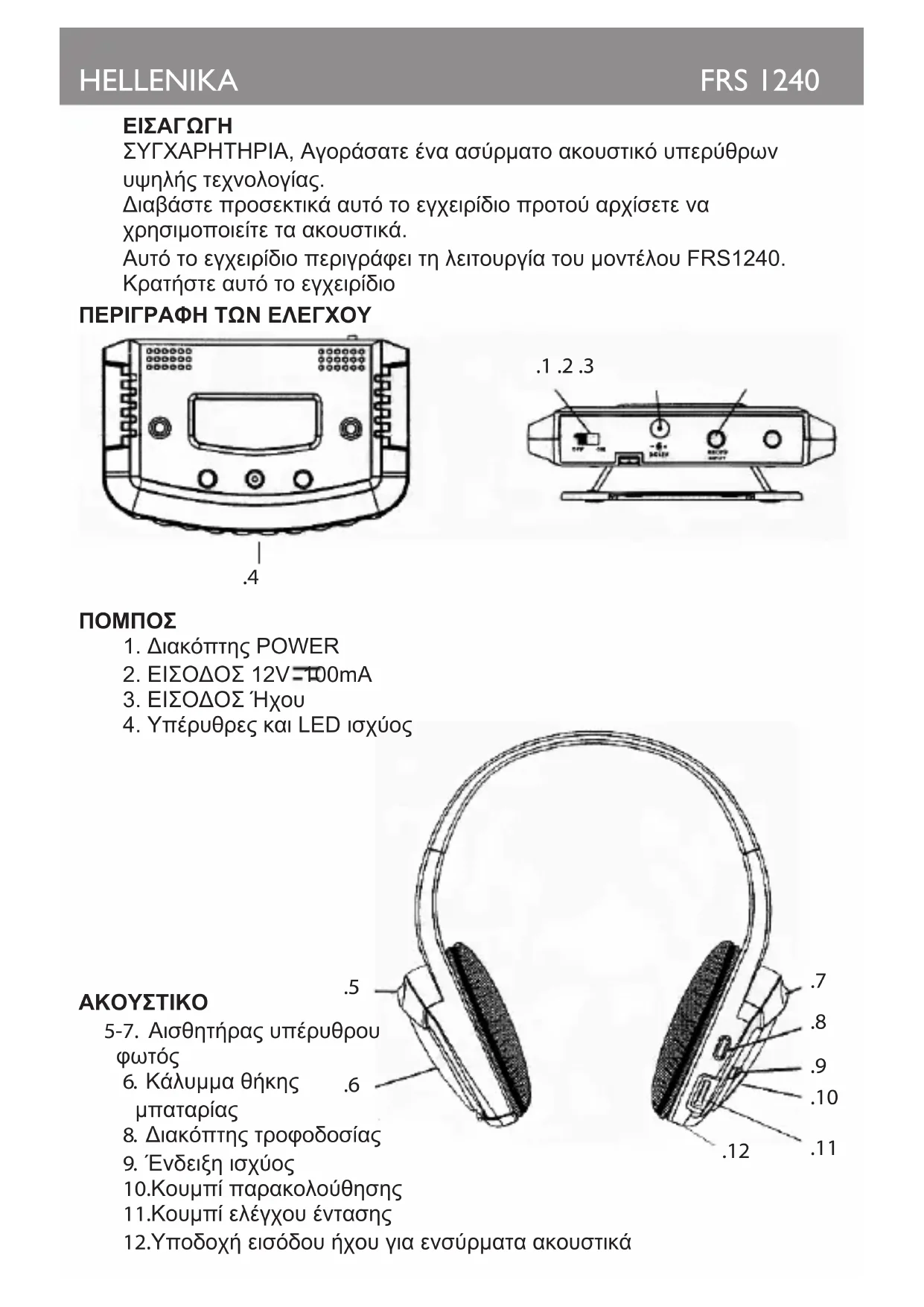ΣΥΓΧΑΡΗΤΗΡΙΑ, Αγοράσατε ένα ασύρματο ακουστικό υπερύθρων υψηλής τεχνολογίας. Διαβάστε προσεκτικά αυτό το εγχειρίδιο προτού αρχίσετε να χρησιμοποιείτε τα ακουστικά. Αυτό το εγχειρίδιο περιγράφει τη λειτουργία του μοντέλου FRS1240. Κρατήστε αυτό το εγχειρίδιο ΠΕΡΙΓΡΑΦΗ ΤΩΝ ΕΛΕΓΧΟΥ