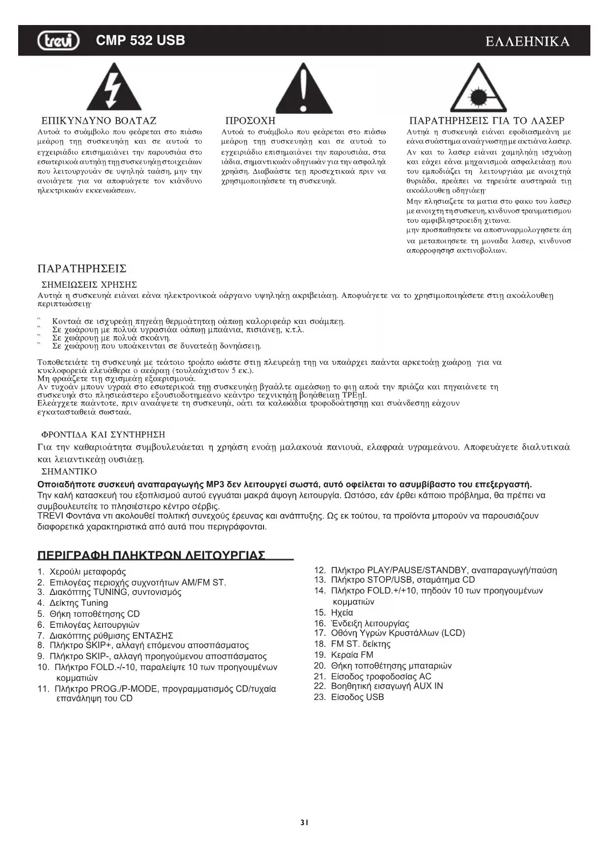 Gia thn kaqario¢thta sumbouleu¢etai h crh¢sh eno¢V malakou¢ paniou¢, elafra¢ ugrame¢nou. Apofeu¢gete dialutika¢ kai leiantike¢V ousi¢eV. SHMANTIKO Οποιαδήποτε συσκευή αναπαραγωγής MP3 δεν λειτουργεί σωστά, αυτό οφείλεται το ασυμβίβαστο του επεξεργαστή. Την καλή κατασκευή του εξοπλισμού αυτού εγγυάται μακρά άψογη λειτουργία. Ωστόσο, εάν έρθει κάποιο πρόβλημα, θα πρέπει να συμβουλευτείτε το πλησιέστερο κέντρο σέρβις.TREVI Φοντάνα ντι ακολουθεί πολιτική συνεχούς έρευνας και ανάπτυξης. Ως εκ τούτου, τα προϊόντα μπορούν να παρουσιάζουν διαφορετικά χαρακτηριστικά από αυτά που περιγράφονται. ΠΕΡΙΓΡΑΦΗ ΠΛΗΚΤΡΩΝ ΛΕΙΤΟΥΡΓΙΑΣ 1. Χερούλι μεταφοράς2. Επιλογέας περιοχής συχνοτήτων AM/FM ST.3. Διακόπτης TUNING, συντονισμός4. Δείκτης Tuning5. Θήκη τοποθέτησης CD6. Επιλογέας λειτουργιών7. Διακόπτης ρύθμισης ΕΝΤΑΣΗΣ8. Πλήκτρο SKIP+, αλλαγή επόμενου αποσπάσματος9. Πλήκτρο SKIP-, αλλαγή προηγούμενου αποσπάσματος 10. Πλήκτρο FOLD.-/-10, παραλείψτε 10 των προηγουμένων κομματιών11. Πλήκτρο PROG./P-MODE, προγραμματισμός CD/τυχαία επανάληψη του CD12. Πλήκτρο PLAY/PAUSE/STANDBY, αναπαραγωγή/παύση13. Πλήκτρο STOP/USB, σταμάτημα CD14. Πλήκτρο FOLD.+/+10, πηδούν 10 των προηγουμένων κομματιών15. Ηχεία16. Ένδειξη λειτουργίας17. Οθόνη Υγρών Κρυστάλλων (LCD)18. FM ST. δείκτης19. Κεραία FM20. Θήκη τοποθέτησης μπαταριών21. Είσοδος τροφοδοσίας AC22. Βοηθητική εισαγωγή AUX IN23. Είσοδος USB32 CMP 532 USB