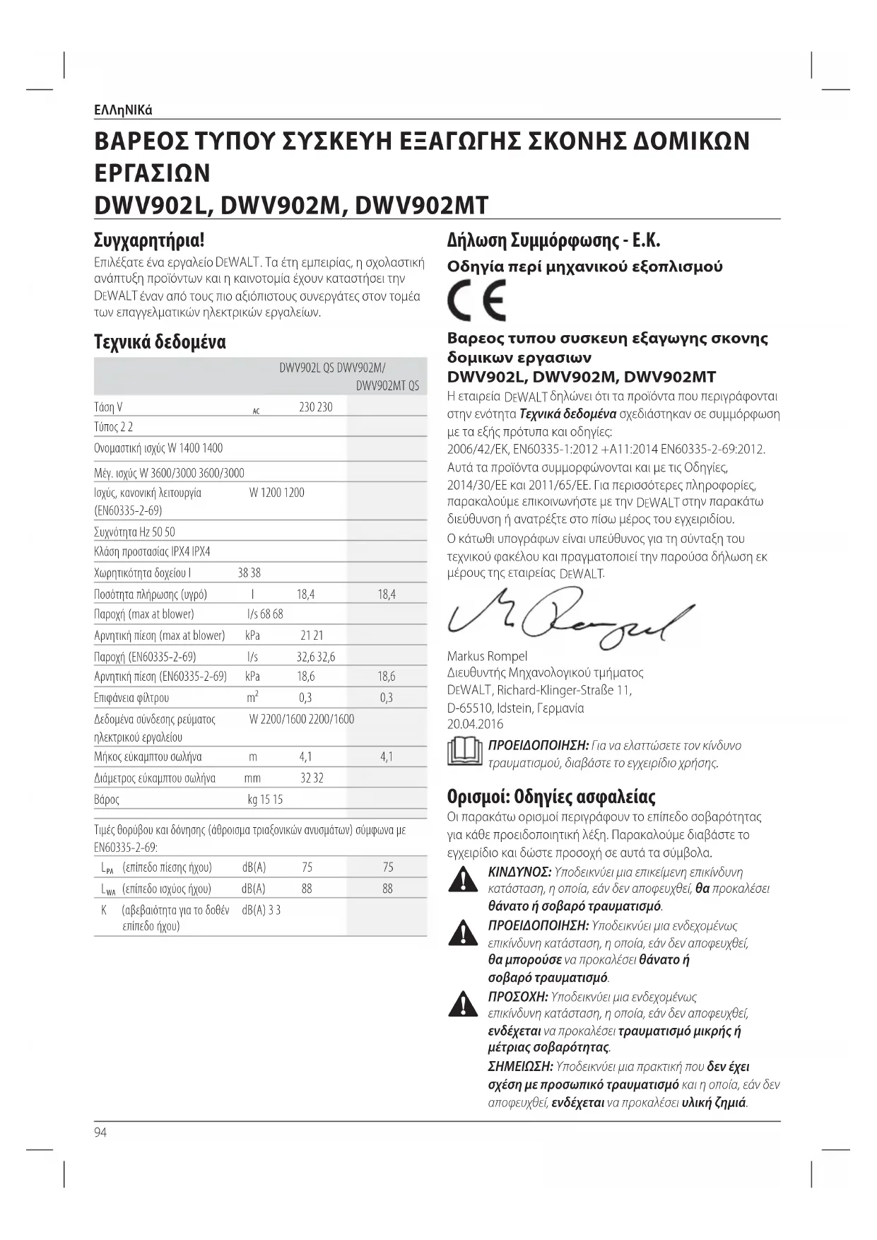 DeWALT δηλώνει ότι τα προϊόντα που περιγράφονται στην ενότητα Τεχνικά δεδομένα σχεδιάστηκαν σε συμμόρφωση με τα εξής πρότυπα και οδηγίες: 2006/42/eK, eN60335-1:2012 +A11:2014 eN60335-2-69:2012. Αυτά τα προϊόντα συμμορφώνονται και με τις Οδηγίες, 2014/30/ΕΕ και 2011/65/ΕΕ. Για περισσότερες πληροφορίες, παρακαλούμε επικοινωνήστε με την DeWALT στην παρακάτω διεύθυνση ή ανατρέξτε στο πίσω μέρος τουεγχειριδίου. Ο κάτωθι υπογράφων είναι υπεύθυνος για τη σύνταξη του τεχνικού φακέλου και πραγματοποιεί την παρούσα δήλωση εκ μέρους της εταιρείας DeWALT