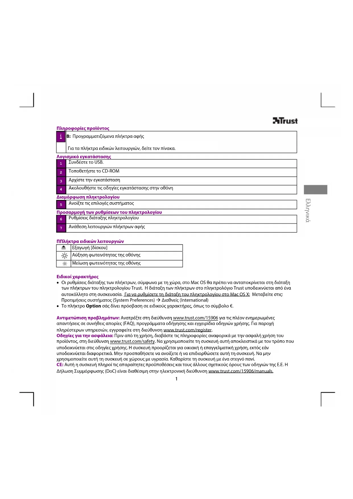 - Το πλήκτρο Option σάς δίνει πρόσβαση σε ειδικούς χαρακτήρες, όπως το σύμβολο €. Αντιμετώπιση προβλημάτων: Ανατρέξτε στη διεύθυνση www.trust.com/15906 για τις πλέον ενημερωμένες απαντήσεις σε συνήθεις απορίες (FAQ), προγράμματα οδήγησης και εγχειρίδια οδηγιών χρήσης. Για παροχή πληρέστερων υπηρεσιών, εγγραφείτε στη διεύθυνση www.trust.com/register. Οδηγίες για την ασφάλεια: Πριν από τη χρήση, διαβάστε τις πληροφορίες αναφορικά με την ασφαλή χρήση του προϊόντος, στη διεύθυνση www.trust.com/safety. Να χρησιμοποιείτε τη συσκευή αυτή αποκλειστικά με τον τρόπο που υποδεικνύεται στις οδηγίες χρήσης. Η συσκευή προορίζεται για οικιακή ή επαγγελματική χρήση, εκτός εάν υποδεικνύεται διαφορετικά. Μην προσπαθήσετε να ανοίξετε ή να επιδιορθώσετε αυτή τη συσκευή. Να μην χρησιμοποιείτε αυτή τη συσκευή σε χώρους με υγρασία. Καθαρίστε τη συσκευή με ένα στεγνό πανί. CE: Αυτή η συσκευή πληροί τις απαραίτητες προϋποθέσεις και τους άλλους σχετικούς όρους των οδηγιών της Ε.Ε. Η Δήλωση Συμμόρφωσης (DoC) είναι διαθέσιμη στην ηλεκτρονική διεύθυνση www.trust.com/15906/manuals.