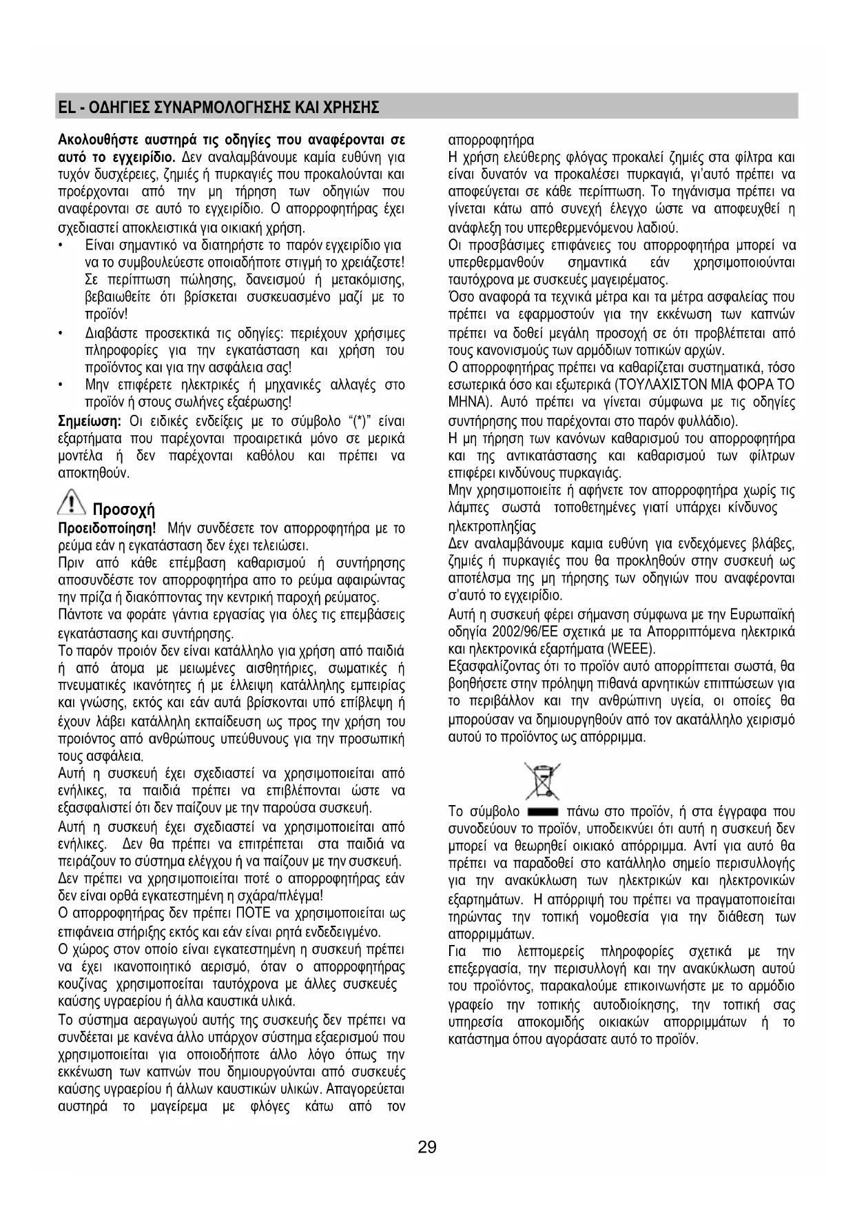 όσο και εξωτερικά (ΤΟΥΛΑΧΙΣΤΟΝ ΜΙΑ ΦΟΡΑ ΤΟ ΜΗΝΑ). Αυτό πρέπει να γίνεται σύμφωνα με τις οδηγίες συντήρησης που παρέχονται στο παρόν φυλλάδιο). Η μη τήρηση των κανόνων καθαρισμού του απορροφητήρα και της αντικατάστασης και καθαρισμού των φίλτρων επιφέρει κινδύνους πυρκαγιάς. Μην χρησιμοποιείτε ή αφήνετε τον απορροφητήρα χωρίς τις λάμπες σωστά τοποθετημένες γιατί υπάρχει κίνδυνος ηλεκτροπληξίας Δεν αναλαμβάνουμε καμια ευθύνη για ενδεχόμενες βλάβες, ζημιές ή πυρκαγιές που θα προκληθούν στην συσκευή ως αποτέλσμα της μη τήρησης των οδηγιών που αναφέρονται σ’αυτό το εγχειρίδιο. Αυτή η συσκευή φέρει σήμανση σύμφωνα με την Ευρωπαϊκή οδηγία 2002/96/ΕΕ σχετικά με τα Απορριπτόμενα ηλεκτρικά και ηλεκτρονικά εξαρτήματα (WEEE). Εξασφαλίζοντας ότι το προϊόν αυτό απορρίπτεται σωστά, θα βοηθήσετε στην πρόληψη πιθανά αρνητικών επιπτώσεων για το περιβάλλον και την ανθρώπινη υγεία, οι οποίες θα μπορούσαν να δημιουργηθούν από τον ακατάλληλο χειρισμό αυτού το προϊόντος ως απόρριμμα.
