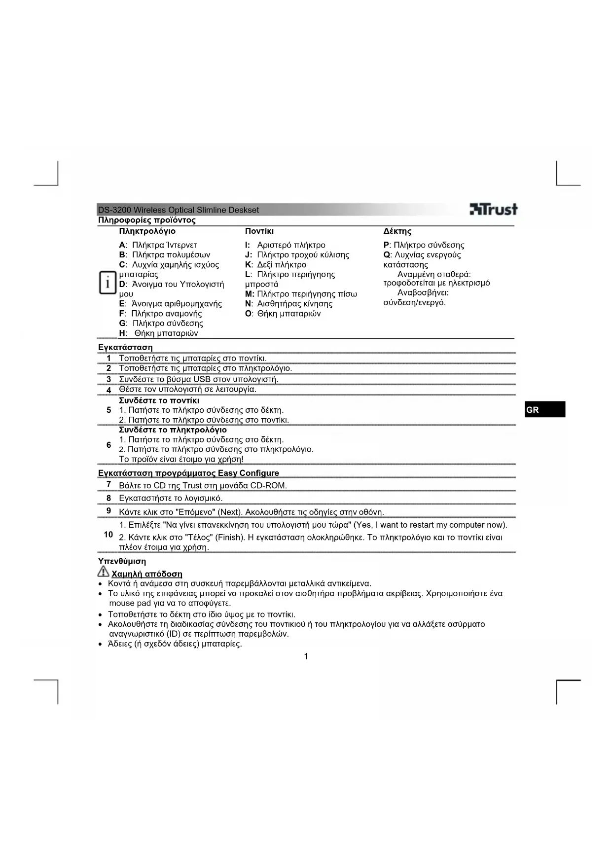 - Απαγορεύεται η αναπαραγωγή αυτού του εγχειριδίου ή οποιουδήποτε µέρους του χωρίς την άδεια της Trust International B.V.DS-3200 Wireless Optical Slimline Deskset
