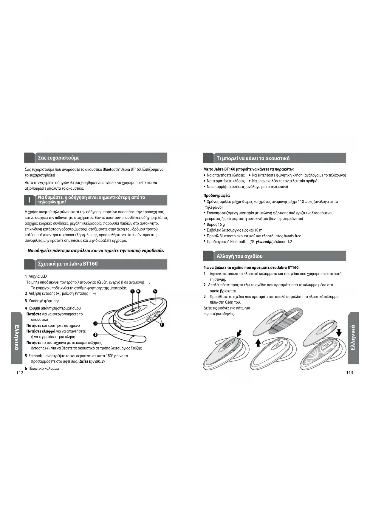 ) 3 Υποδοχή φόρτισης4 Κουμπί απάντησης/τερματισμού Πατήστε για να ενεργοποιήσετε το ακουστικό Πατήστε και κρατήστε πατημένο Πατήστε ελαφρά για να απαντήσετε ή να τερματίσετε μια κλήση Πατήστε το ταυτόχρονα με το κουμπί αύξησης έντασης (+), για να θέσετε το ακουστικό σε τρόπο λειτουργίας ζεύξης5 Earhook – αναστρέψτε το και περιστρέψτε κατά 180° για να το προσαρμόσετε στο αφτί σας. (Δείτε την εικ. 2)6 Πλαστικό κάλυμμαΜε το Jabra BT160 μπορείτε να κάνετε τα παρακάτω: • Να απαντήσετε κλήσεις • Να εκτελέσετε φωνητική κλήση (ανάλογα με το τηλέφωνο) • Να τερματίσετε κλήσεις • Να επανακαλέσετε τον τελευταίο αριθμό • Να απορρίψετε κλήσεις (ανάλογα με το τηλέφωνο)Προδιαγραφές: • Χρόνος ομιλίας μέχρι 8 ώρες και χρόνος αναμονής μέχρι 110 ώρες (ανάλογα με το τηλέφωνο) • Επαναφορτιζόμενη μπαταρία με επιλογή φόρτισης από πρίζα εναλλασσόμενου ρεύματος ή από φορτιστή αυτοκινήτου (δεν περιλαμβάνεται) • Βάρος 16 g • Εμβέλεια λειτουργίας έως και 10 m • Προφίλ Bluetooth ακουστικού και εξαρτήματος hands-free • Προδιαγραφή Bluetooth 1 (βλ. γλωσσάρι) έκδοση 1.2 Τι μπορεί να κάνει το ακουστικό Για να βάλετε το σχέδιο που προτιμάτε στο Jabra BT160: 1 Αφαιρέστε απαλά τα πλαστικά καλύμματα και το σχέδιο που χρησιμοποιείται αυτή τη στιγμή. 2 Απαλά πιέστε προς τα έξω το σχέδιο που προτιμάτε από το κάλυμμα μέσα στο οποίο βρίσκεται. 3 Προσθέστε το σχέδιο που προτιμάτε και απαλά ασφαλίστε το πλαστικό κάλυμμα πίσω στη θέση του. Δείτε τις εικόνες πιο κάτω γιαπεραιτέρω οδηγίες. Αλλαγή του σχεδίου