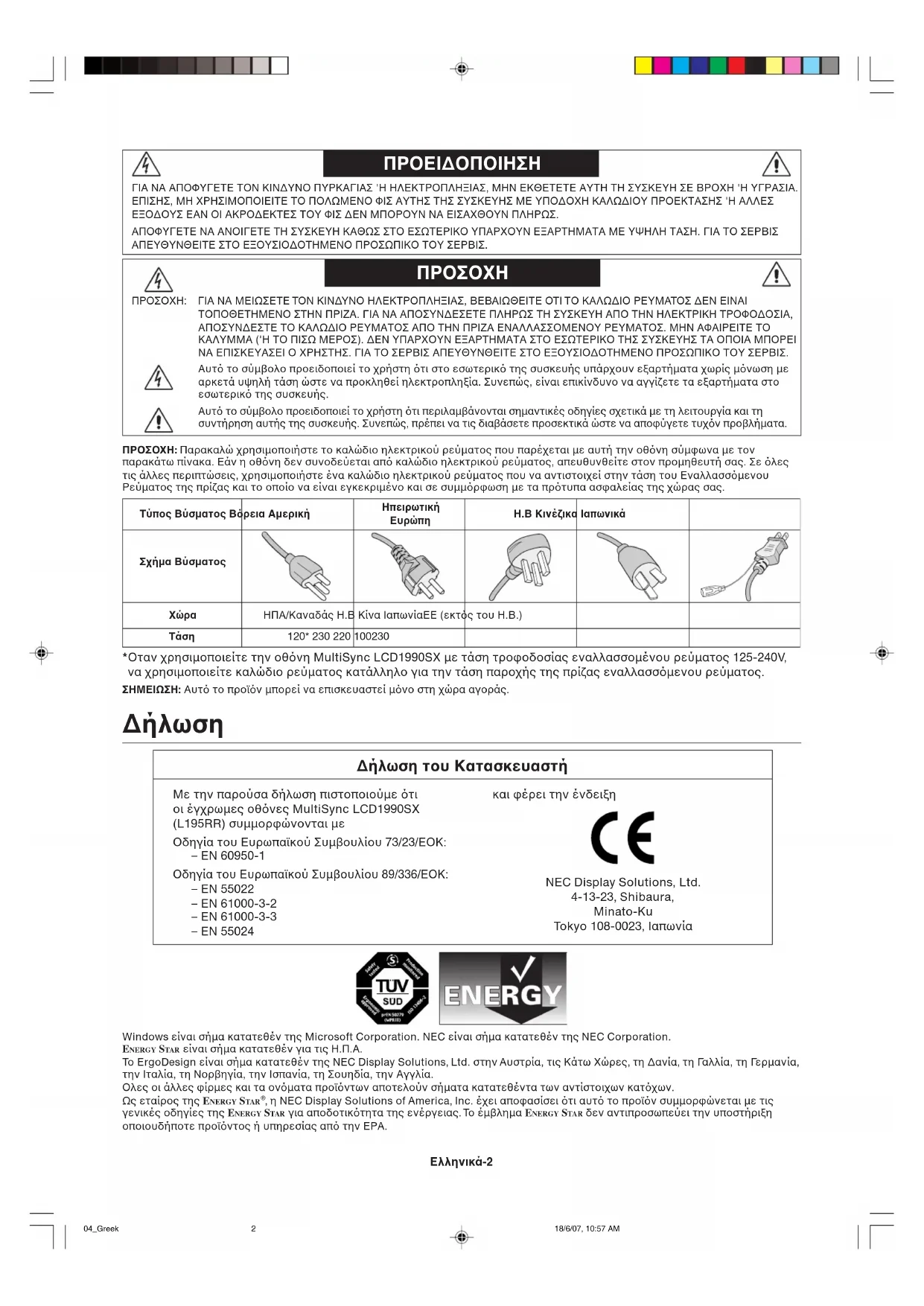 ∆ήλωση του Κατασκευαστή Με την παρούσα δήλωση πιστοποιούµε τι οι έγχρωµες οθνες MultiSync LCD1990SX (L195RR) συµµορφώνονται µε Οδηγία του Ευρωπαϊκού Συµβουλίου 73/23/ΕΟΚ: – EN 60950-1 Οδηγία του Ευρωπαϊκού Συµβουλίου 89/336/ΕΟΚ: – EN 55022 – EN 61000-3-2 – EN 61000-3-3 – EN 55024 και φέρει την ένδειξη NEC Display Solutions, Ltd. 4-13-23, Shibaura, Minato-Ku Tokyo 108-0023, Ιαπωνία Windows είναι σήµα κατατεθέν της Microsoft Corporation. NEC είναι σήµα κατατεθέν της NEC Corporation. ENERGY STAR είναι σήµα κατατεθέν για τις Η.Π.Α. Το ΕrgoDesign είναι σήµα κατατεθέν της NEC Display Solutions, Ltd. στην Αυστρία, τις Κάτω Χώρες, τη ∆ανία, τη Γαλλία, τη Γερµανία, την Ιταλία, τη Νορβηγία, την Ισπανία, τη Σουηδία, την Αγγλία. Ολες οι άλλες φίρµες και τα ονµατα προϊντων αποτελούν σήµατα κατατεθέντα των αντίστοιχων κατχων. Ως εταίρος της ENERGY STAR
