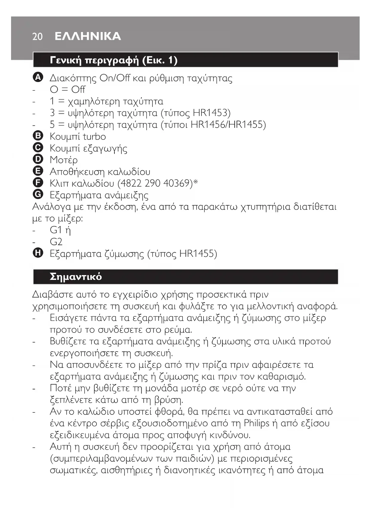 Διαβάστε αυτό το εγχειρίδιο χρήσης προσεκτικά πριν χρησιμοποιήσετε τη συσκευή και φυλάξτε το για μελλοντική αναφορά. Eισάγετε πάντα τα εξαρτήματα ανάμειξης ή ζύμωσης στο μίξερ προτού το συνδέσετε στο ρεύμα. Bυθίζετε τα εξαρτήματα ανάμειξης ή ζύμωσης στα υλικά προτού ενεργοποιήσετε τη συσκευή. Να αποσυνδέετε το μίξερ από την πρίζα πριν αφαιρέσετε τα εξαρτήματα ανάμειξης ή ζύμωσης και πριν τον καθαρισμό. Ποτέ μην βυθίζετε τη μονάδα μοτέρ σε νερό ούτε να την ξεπλένετε κάτω από τη βρύση. Αν το καλώδιο υποστεί φθορά, θα πρέπει να αντικατασταθεί από ένα κέντρο σέρβις εξουσιοδοτημένο από τη Philips ή από εξίσου εξειδικευμένα άτομα προς αποφυγή κινδύνου. Αυτή η συσκευή δεν προορίζεται για χρήση από άτομα (συμπεριλαμβανομένων των παιδιών) με περιορισμένες σωματικές, αισθητήριες ή διανοητικές ικανότητες ή από άτομα