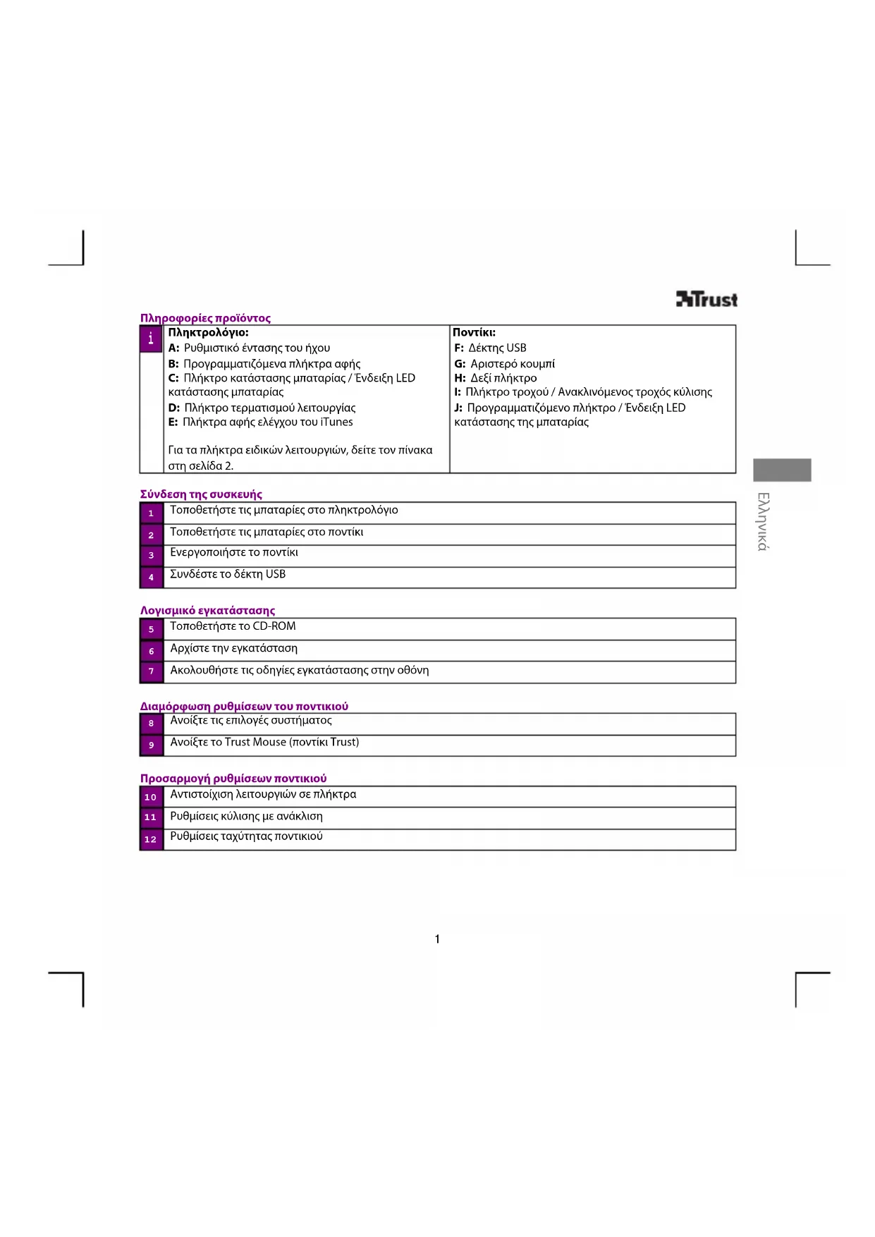 F: Δέκτης USB G: Αριστερό κουμπί H: Δεξί πλήκτρο I: Πλήκτρο τροχού / Ανακλινόμενος τροχός κύλισης J: Προγραμματιζόμενο πλήκτρο / Ένδειξη LED κατάστασης της μπαταρίας Σύνδεση της συσκευής Τοποθετήστε τις μπαταρίες στο πληκτρολόγιο Τοποθετήστε τις μπαταρίες στο ποντίκι Ενεργοποιήστε το ποντίκι Συνδέστε το δέκτη USB Λογισμικό εγκατάστασης Τοποθετήστε το CD-ROM Αρχίστε την εγκατάσταση Ακολουθήστε τις οδηγίες εγκατάστασης στην οθόνη Διαμόρφωση ρυθμίσεων του ποντικιού Ανοίξτε τις επιλογές συστήματος Ανοίξτε το Trust Mouse (ποντίκι Trust) Προσαρμογή ρυθμίσεων ποντικιού Αντιστοίχιση λειτουργιών σε πλήκτρα Ρυθμίσεις κύλισης με ανάκλιση Ρυθμίσεις ταχύτητας ποντικιού
