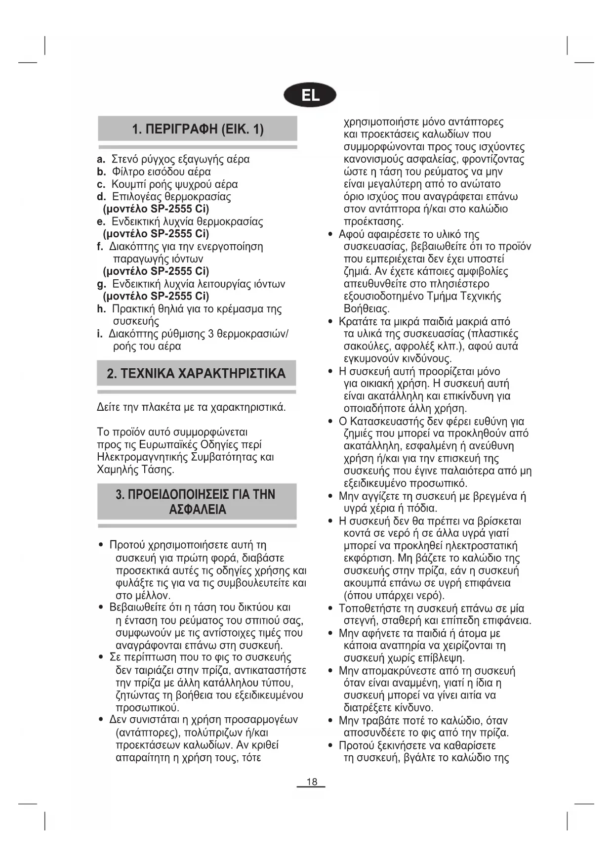 a. Στενό ρύγχος εξαγωγής αέρα b. Φίλτρο εισόδου αέρα c. Κουμπί ροής ψυχρού αέρα d. Eπιλογέας θερμοκρασίας (μοντέλο SP-2555 Ci) e. Ενδεικτική λυχνία θερμοκρασίας (μοντέλο SP-2555 Ci) f. Διακόπτης για την ενεργοποίηση παραγωγής ιόντων (μοντέλο SP-2555 Ci) g. Ενδεικτική λυχνία λειτουργίας ιόντων (μοντέλο SP-2555 Ci) h. Πρακτική θηλιά για το κρέμασμα της