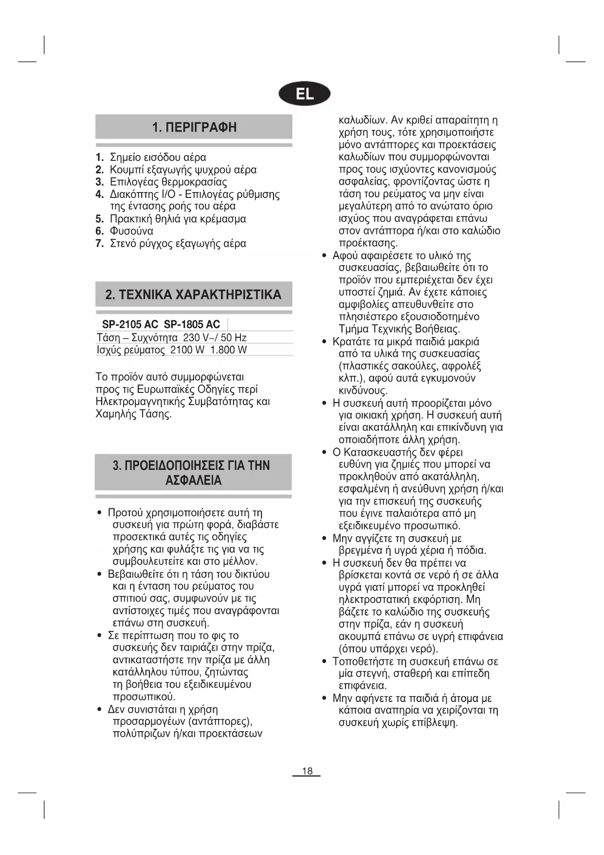Το προϊόν αυτό συμμορφώνεται προς τις Ευρωπαϊκές Οδηγίες περί Ηλεκτρομαγνητικής Συμβατότητας και Χαμηλής Τάσης. SP-2105 AC SP-1805 AC Τάση – Συχνότητα 230 V~/ 50 Hz Ισχύς ρεύματος 2100 W 1.800 W19