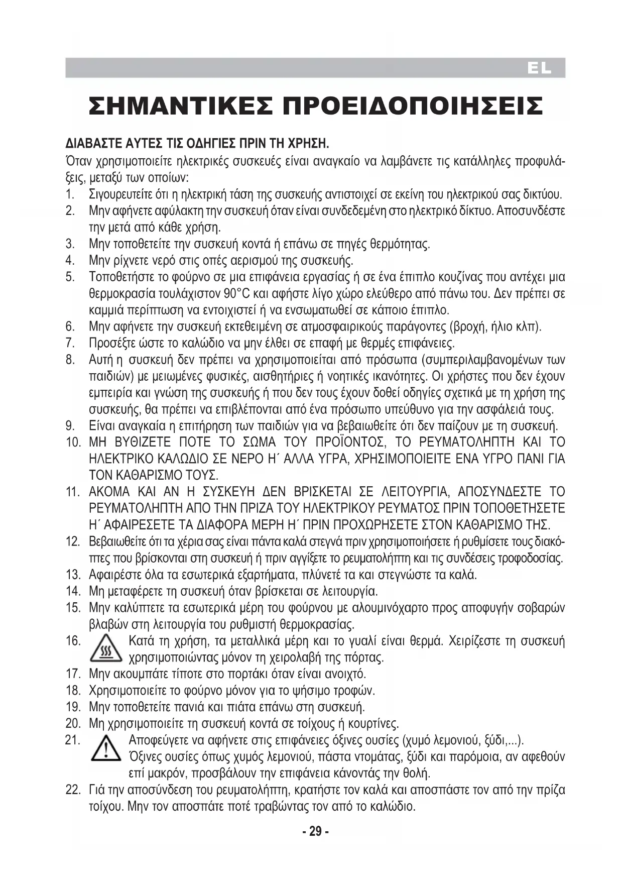 συσκευή δεν πρέπει να χρησιμοποιείται από πρόσωπα (συμπεριλαμβανομένων των 8. παιδιών) με μειωμένες φυσικές, αισθητήριες ή νοητικές ικανότητες. Οι χρήστες που δεν έχουν εμπειρία και γνώση της συσκευής ή που δεν τους έχουν δοθεί οδηγίες σχετικά με τη χρήση της συσκευής, θα πρέπει να επιβλέπονται από ένα πρόσωπο υπεύθυνο για την ασφάλειά τους. Είναι αναγκαία η επιτήρηση των παιδιών για να βεβαιωθείτε ότι δεν παίζουν με τη συσκευή. 9. ΜΗ ΒΥΘΙΖΕΤΕ ΠΟΤΕ ΤΟ ΣΩΜΑ ΤΟΥ ΠΡΟΪΟΝΤΟΣ, ΤΟ ΡΕΥΜΑΤΟΛΗΠΤΗ ΚΑΙ ΤΟ 10. ΗΛΕΚΤΡΙΚΟ ΚΑΛΩΔΙΟ ΣΕ ΝΕΡΟ Η΄ ΑΛΛΑ ΥΓΡΑ, ΧΡΗΣΙΜΟΠΟΙΕΙΤΕ ΕΝΑ ΥΓΡΟ ΠΑΝΙ ΓΙΑ ΤΟΝ ΚΑΘΑΡΙΣΜΟ ΤΟΥΣ. ΑΚΟΜΑ ΚΑΙ ΑΝ Η ΣΥΣΚΕΥΗ ΔΕΝ ΒΡΙΣΚΕΤΑΙ ΣΕ ΛΕΙΤΟΥΡΓΙΑ, ΑΠΟΣΥΝΔΕΣΤΕ ΤΟ 11. ΡΕΥΜΑΤΟΛΗΠΤΗ ΑΠΟ ΤΗΝ ΠΡΙΖΑ ΤΟΥ ΗΛΕΚΤΡΙΚΟΥ ΡΕΥΜΑΤΟΣ ΠΡΙΝ ΤΟΠΟΘΕΤΗΣΕΤΕ Η΄ ΑΦΑΙΡΕΣΕΤΕ ΤΑ ΔΙΑΦΟΡΑ ΜΕΡΗ Η΄ ΠΡΙΝ ΠΡΟΧΩΡΗΣΕΤΕ ΣΤΟΝ ΚΑΘΑΡΙΣΜΟ ΤΗΣ. Βεβαιωθείτε ότι τα χέρια σας είναι πάντα καλά στεγνά πριν χρησιμοποιήσετε ή ρυθμίσετε τους διακό-12. πτες που βρίσκονται στη συσκευή ή πριν αγγίξετε το ρευματολήπτη και τις συνδέσεις τροφοδοσίας. Αφαιρέστε όλα τα εσωτερικά εξαρτήματα, πλύνετέ τα και στεγνώστε τα καλά. 13. Μη μεταφέρετε τη συσκευή όταν βρίσκεται σε λειτουργία. 14. Μην καλύπτετε τα εσωτερικά μέρη του φούρνου με αλουμινόχαρτο προς αποφυγήν σοβαρών 15. βλαβών στη λειτουργία του ρυθμιστή θερμοκρασίας. Κατά τη χρήση, τα μεταλλικά μέρη και το γυαλί είναι θερμά. Χειρίζεστε τη συσκευή 16. χρησιμοποιώντας μόνον τη χειρολαβή της πόρτας. Μην ακουμπάτε τίποτε στο πορτάκι όταν είναι ανοιχτό. 17. Χρησιμοποιείτε το φούρνο μόνον για το ψήσιμο τροφών. 18. Μην τοποθετείτε πανιά και πιάτα επάνω στη συσκευή. 19. Μη χρησιμοποιείτε τη συσκευή κοντά σε τοίχους ή κουρτίνες. 20. Αποφεύγετε να αφήνετε στις επιφάνειες όξινες ουσίες ( χυμό λεμονιού, ξύδι,...). 21. Όξινες ουσίες όπως χυμός λεμονιού, πάστα ντομάτας, ξύδι και παρόμοια, αν αφεθούν επί μακρόν, προσβάλουν την επιφάνεια κάνοντάς την θολή. Γιά την αποσύνδεση του ρευματολήπτη, κρατήστε τον καλά και αποσπάστε τον από την πρίζα 22. τοίχου. Μην τον αποσπάτε ποτέ τραβώντας τον από το καλώδιο.EL