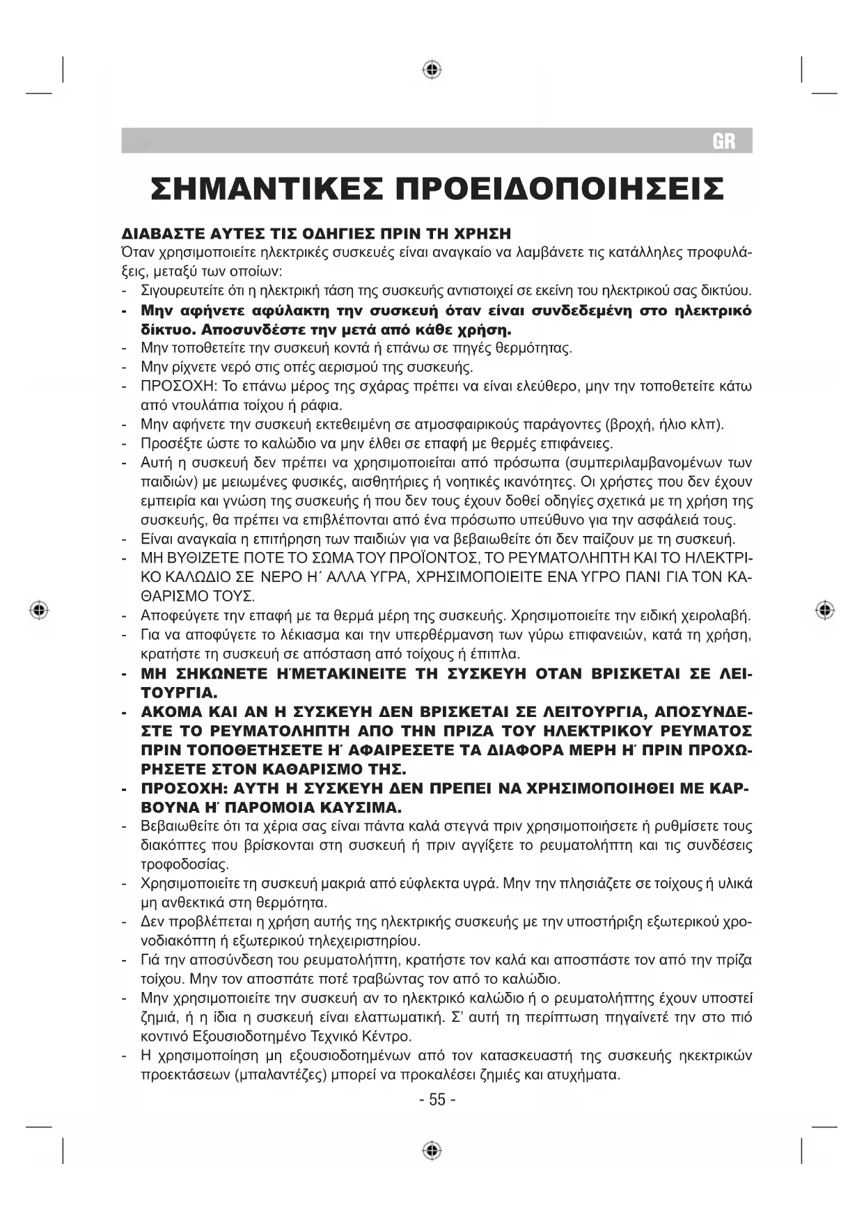 ΠΡΟΣΟΧΗ: Μη βυθίζετε ποτέ τη συσκευή και το ηλεκτρικό καλώδιο σε νερό ή άλλα υγρά.