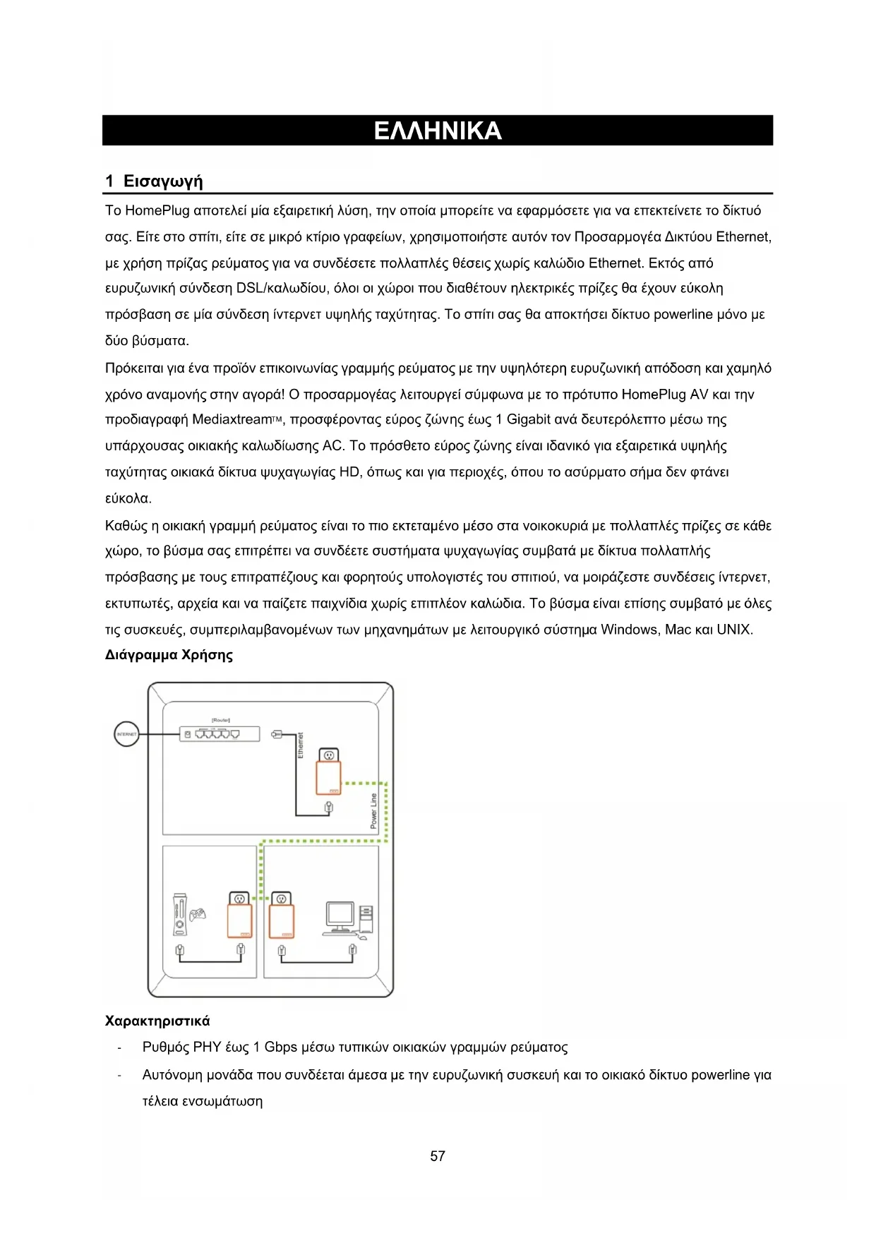 56ΕΛΛΗΝΙΚA HomePlug 1 Εισαγωγή Το HomePlug αποτελεί μία εξαιρετική λύση, την οποία μπορείτε να εφαρμόσετε για να επεκτείνετε το δίκτυό σας. Είτε στο σπίτι, είτε σε μικρό κτίριο γραφείων, χρησιμοποιήστε αυτόν τον Προσαρμογέα Δικτύου Ethernet, με χρήση πρίζας ρεύματος για να συνδέσετε πολλαπλές θέσεις χωρίς καλώδιο Ethernet. Εκτός από ευρυζωνική σύνδεση DSL/καλωδίου, όλοι οι χώροι που διαθέτουν ηλεκτρικές πρίζες θα έχου