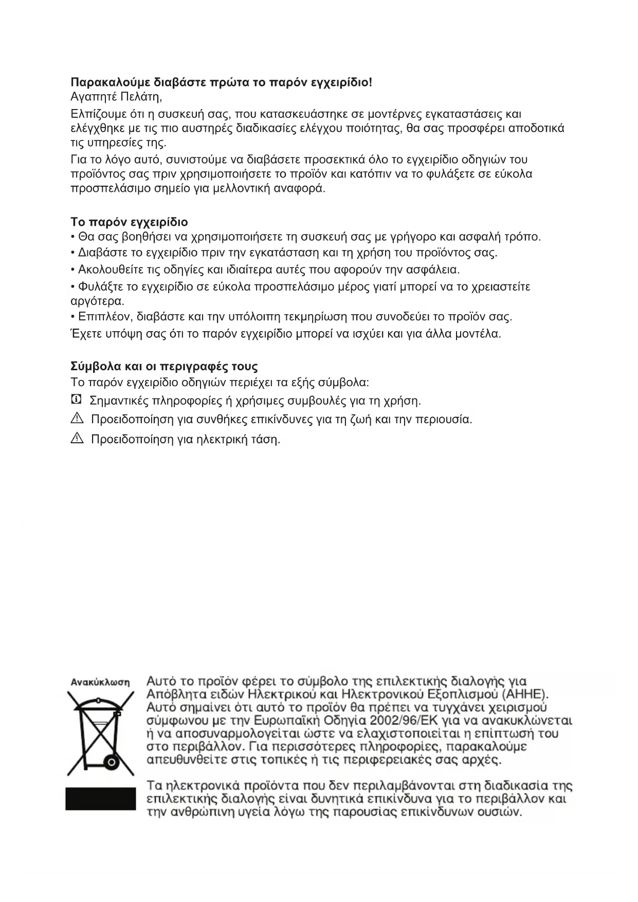 Το παρόν εγχειρίδιο οδηγιών περιέχει τα εξής σύμβολα: