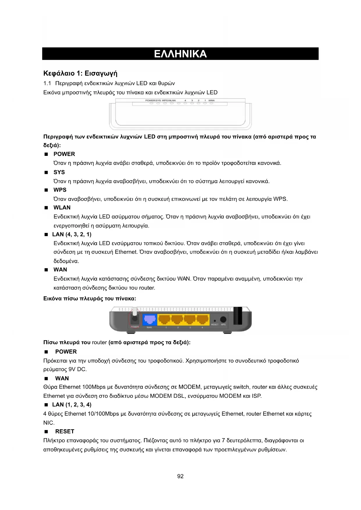 POWER Όταν η πράσινη λυχνία ανάβει σταθερά, υποδεικνύει ότι το προϊόν τροφοδοτείται κανονικά. SYS Όταν η πράσινη λυχνία αναβοσβήνει, υποδεικνύει ότι το σύστημα λειτουργεί κανονικά. WPS Όταν αναβοσβήνει, υποδεικνύει ότι η συσκευή επικοινωνεί με τον πελάτη σε λειτ ουργία WPS. WLAN Ενδεικτική λυχνία LED ασύρματου σήματος. Όταν η πράσινη λυχνία αναβοσβήνει, υποδεικνύει ότι έχει ενεργοποιηθεί η ασύρματη λειτουργία. LAN (4, 3, 2, 1) Ενδεικτική λυχνία LED ενσύρματου τοπικού δικτύου. Όταν ανάβει σταθερά, υποδεικνύει ότι έχει γίνει σύνδεση με τη συσκευή Ethernet. Όταν αναβοσβήνει, υποδεικνύει ότι η συσκευή μεταδίδει ή/και λαμβάνει
